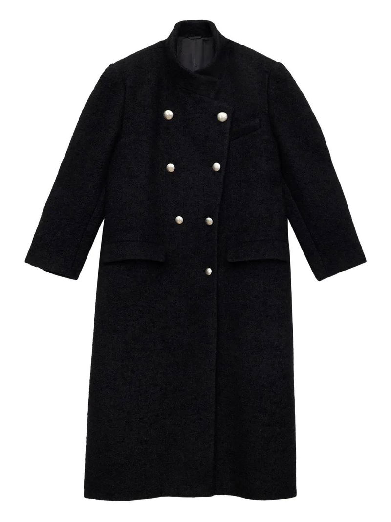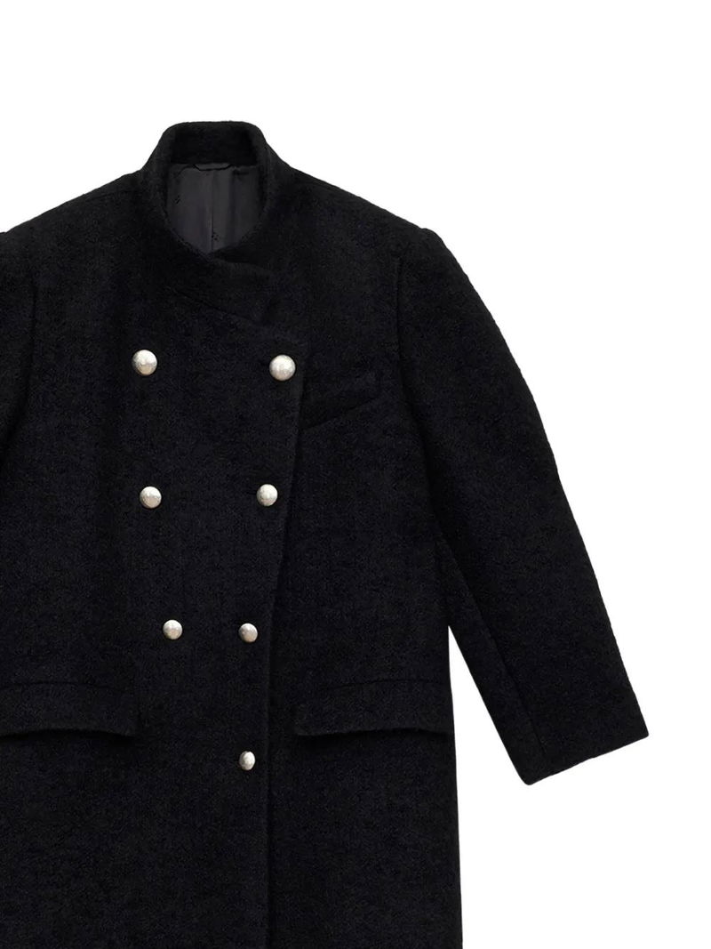 black double-breasted button fastening flap pockets long sleeves textured finish mid-length