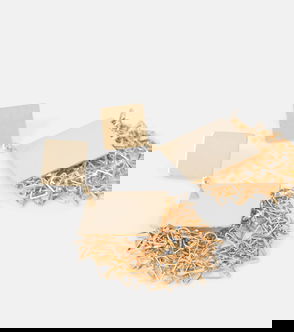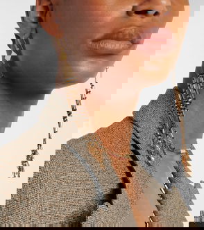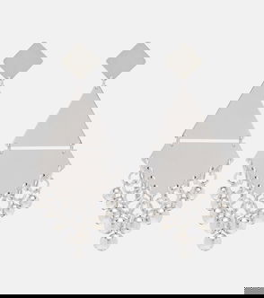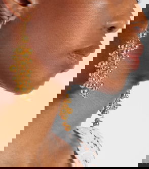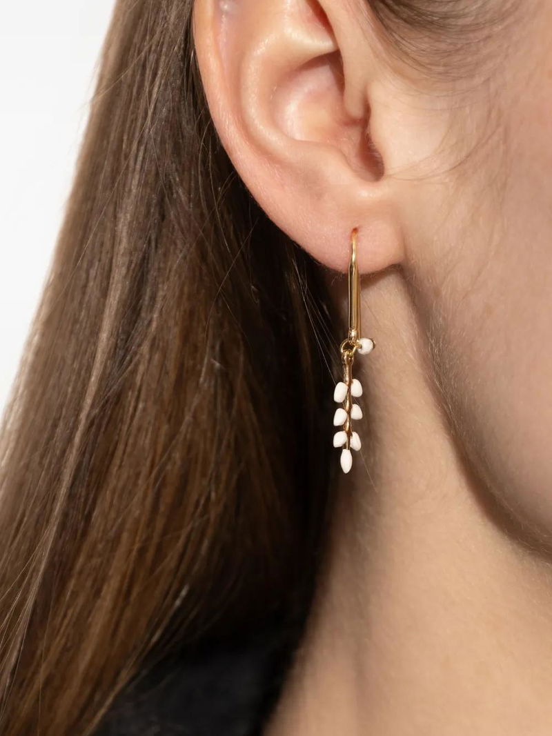 Off-white, drop design, gold-tone finish, leaf embellishments, hook fastening, asymmetric design.