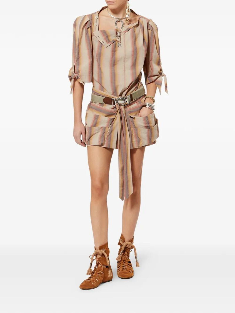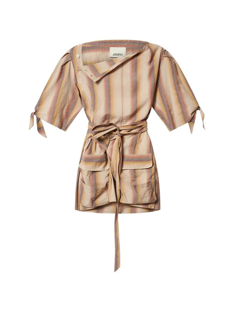 Orange, striped pattern, boat neck, flap pockets, belted waist.