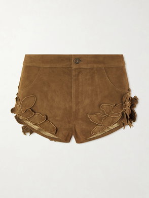 Brown suede, patch pockets, turn-up hems.