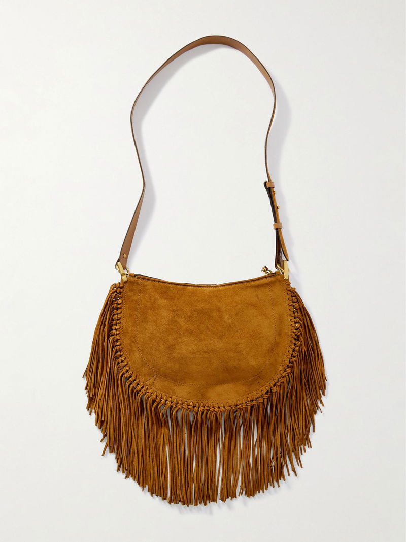 Crafted from supple suede, it has a half-moon shape traced with swishy fringing and opens to a twill-lined interior sized to fit your phone, cardholder and keys.