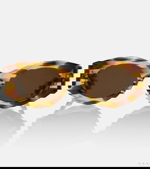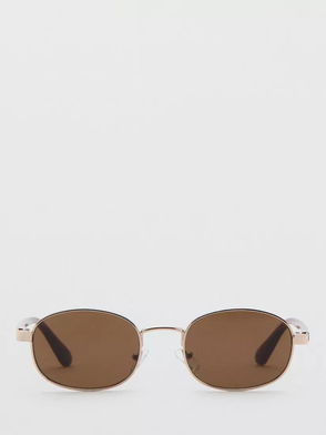 Brown, silver-tone hardware, screw hinges, curved temples, nose pads.