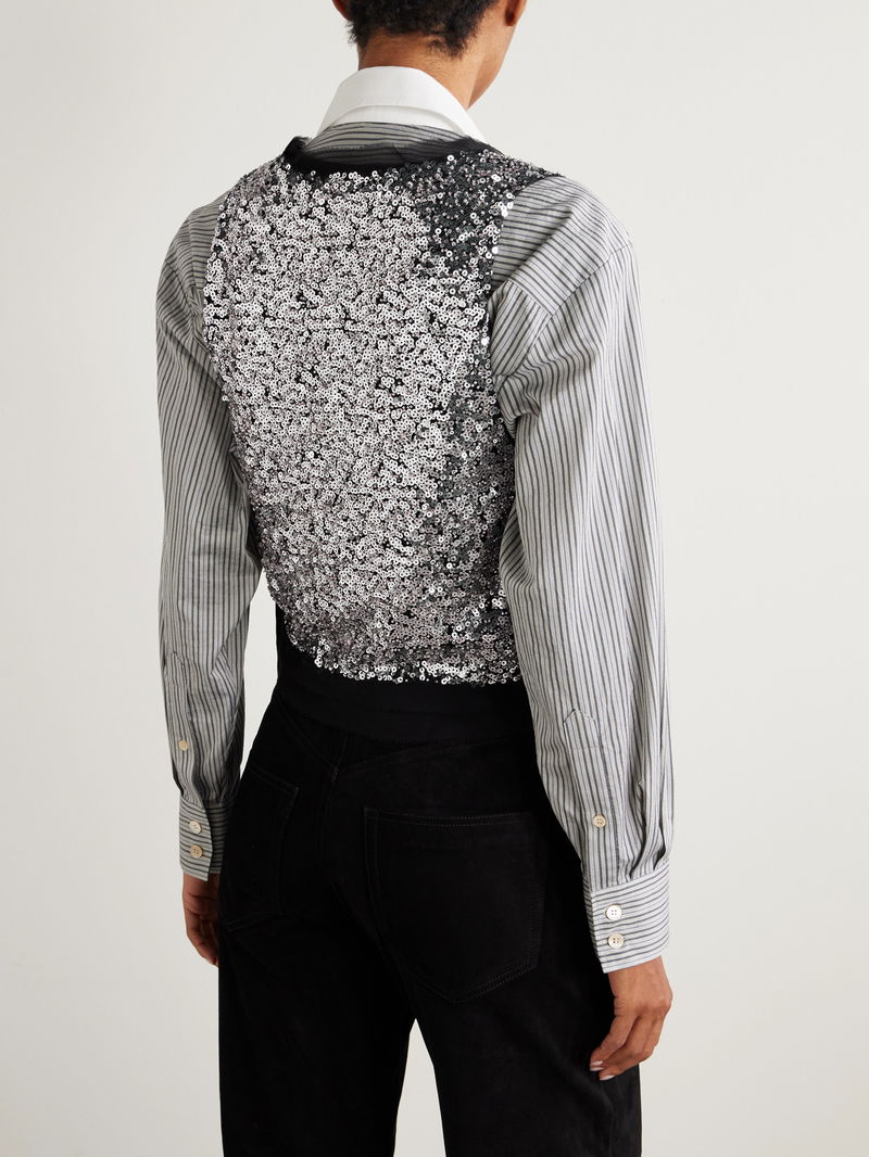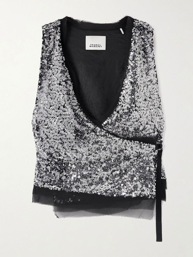 Tahina Tulle-trimmed Sequined Crepe Wrap Top