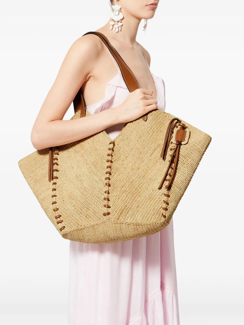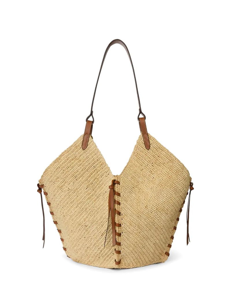 Light brown raffia leather trims tassel detail shoulder strap open top.