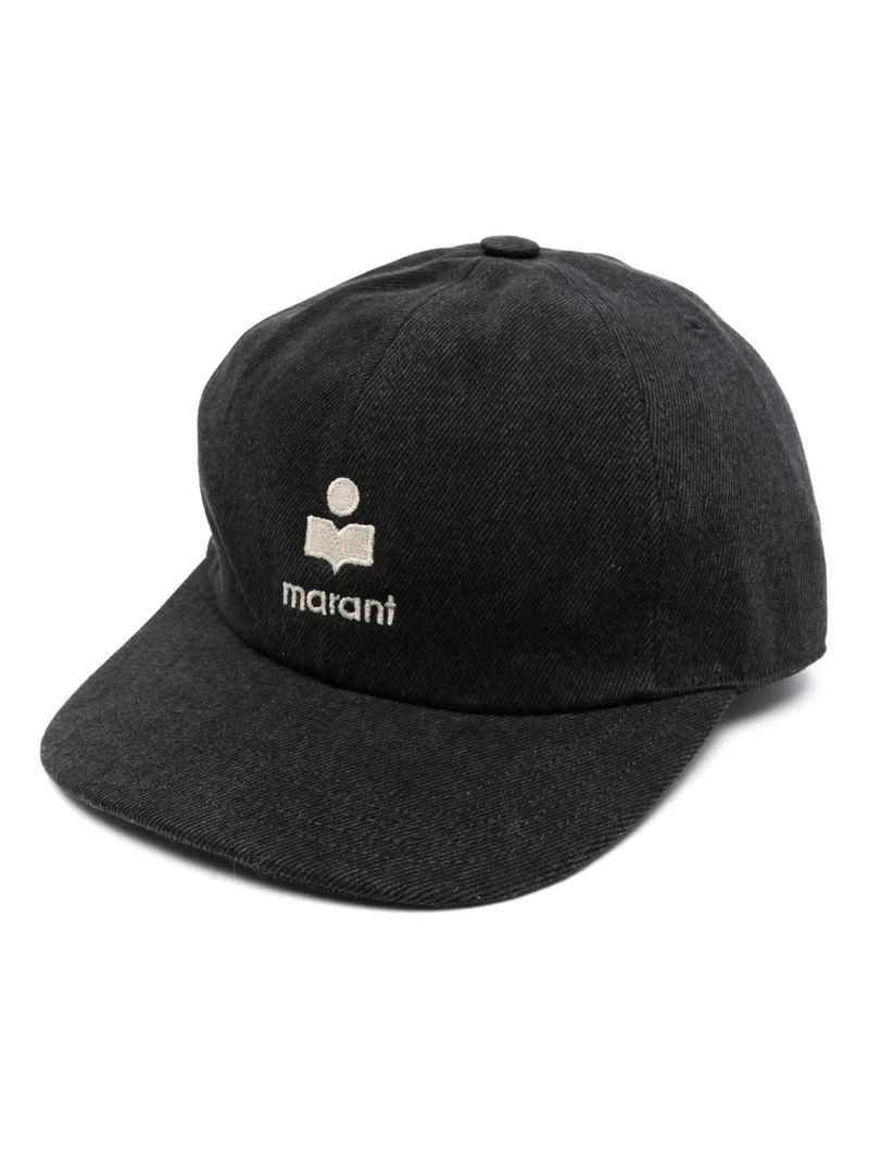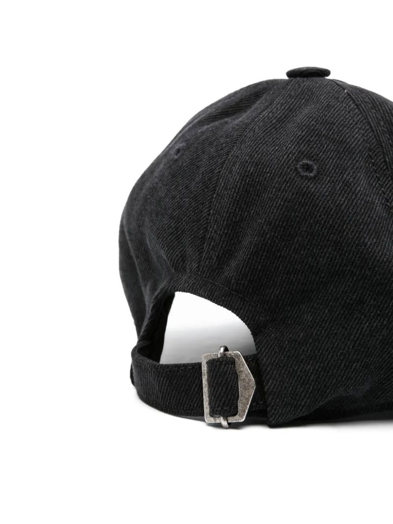 Black, cotton twill weave, embroidered logo to the front, eyelet detailing, fabric-covered button at the crown, six-panel construction, flat peak, adjustable strap to the rear, full lining.
