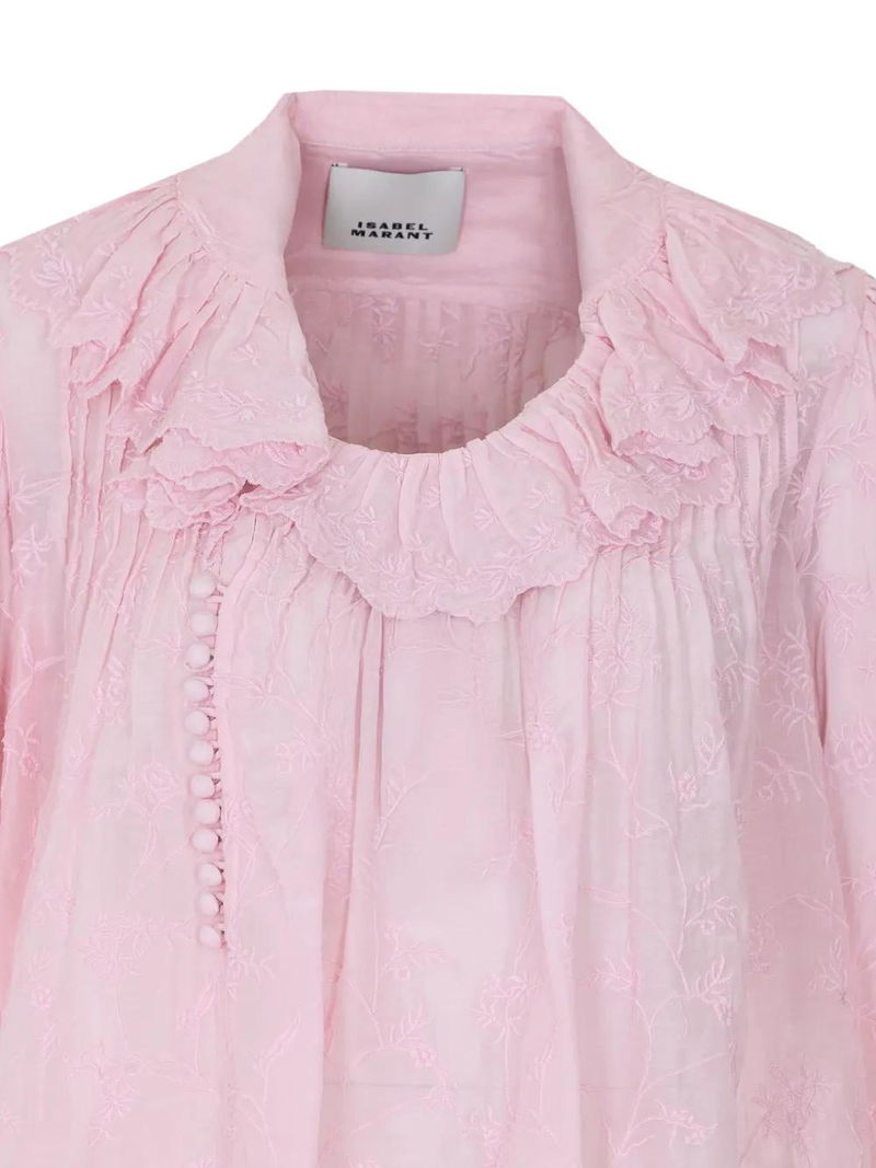 Pink, button closure, long sleeves, buttons on cuffs, ruffle detail.