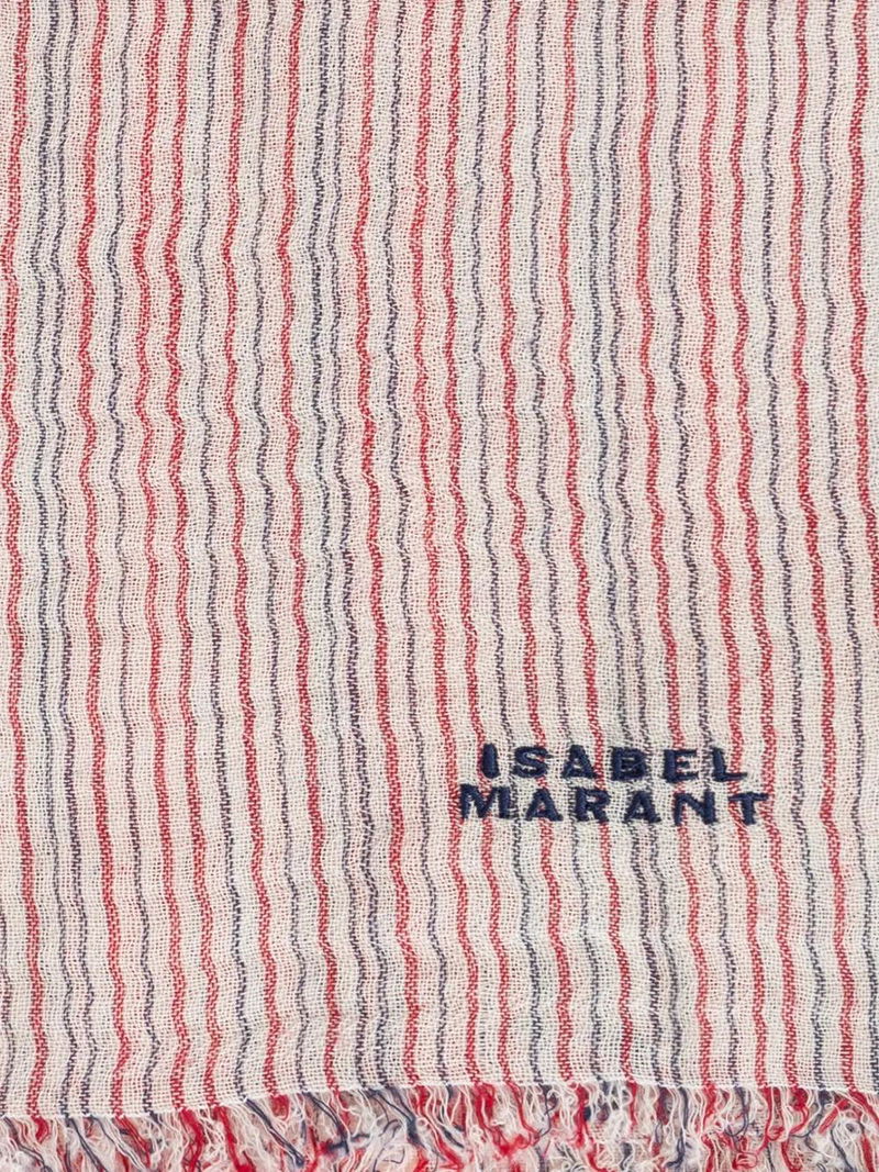 Cream and red, striped, fringed trim.