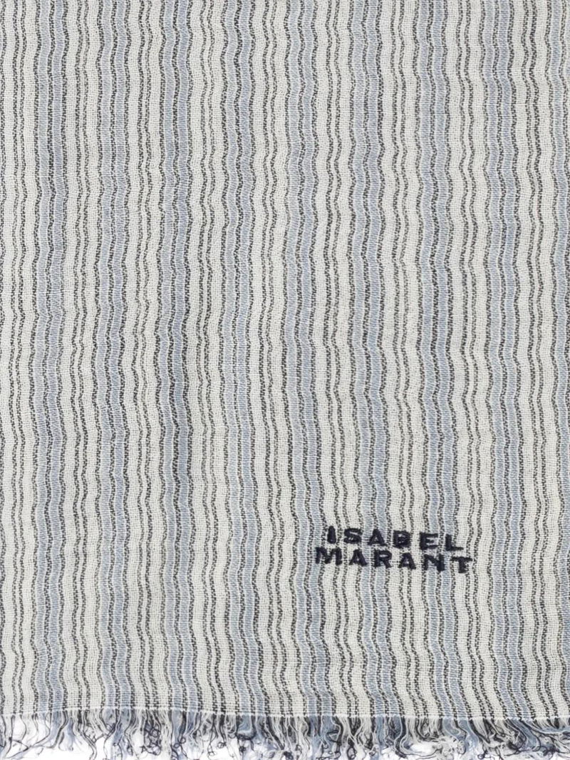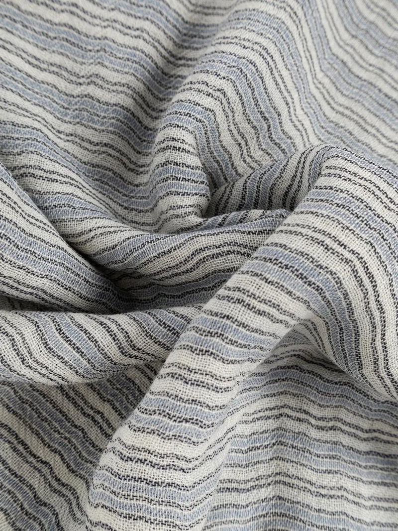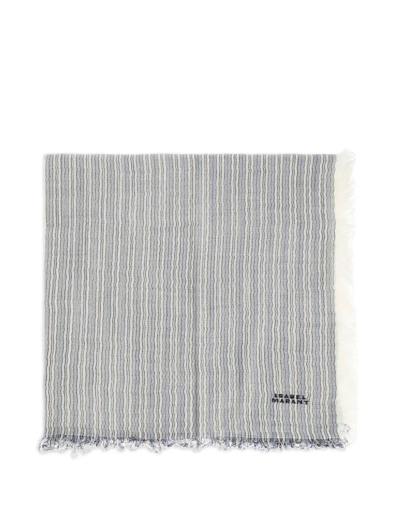 Off-white and blue, stripe pattern, fringed edge, logo detail.