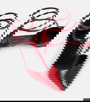 Red snakeskin effect kitten heel pointed toe leather bow embellishment.