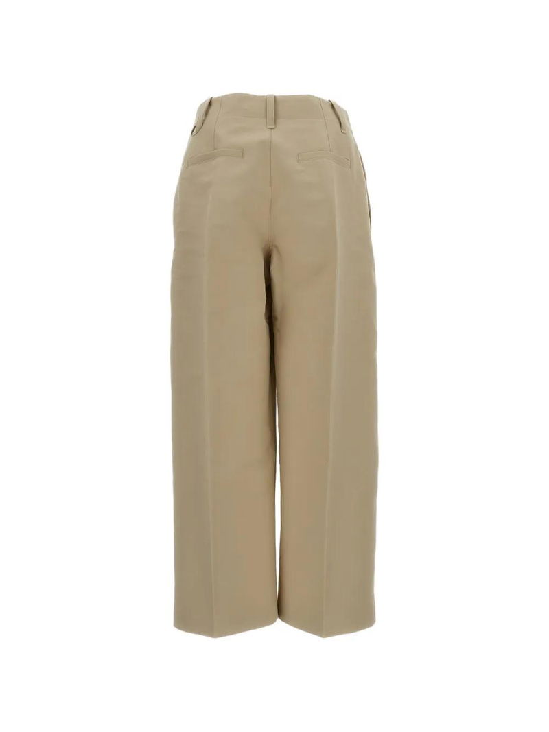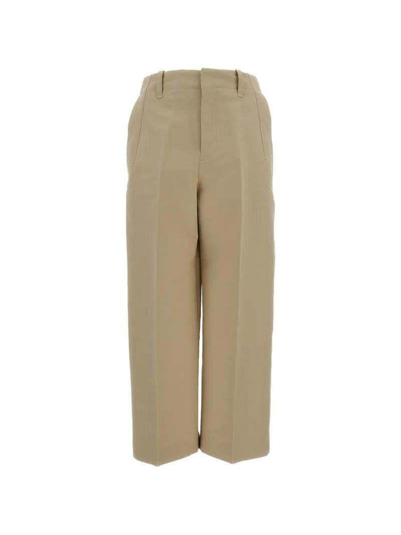 Beige, belt loops, slant side pockets, rear welt pockets, pressed creases, ankle-length.
