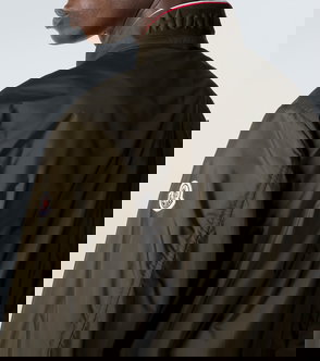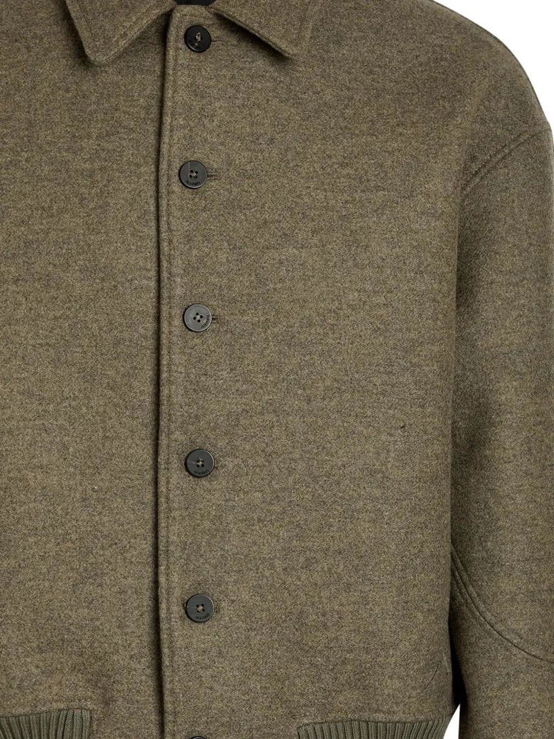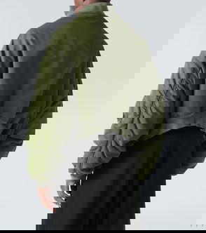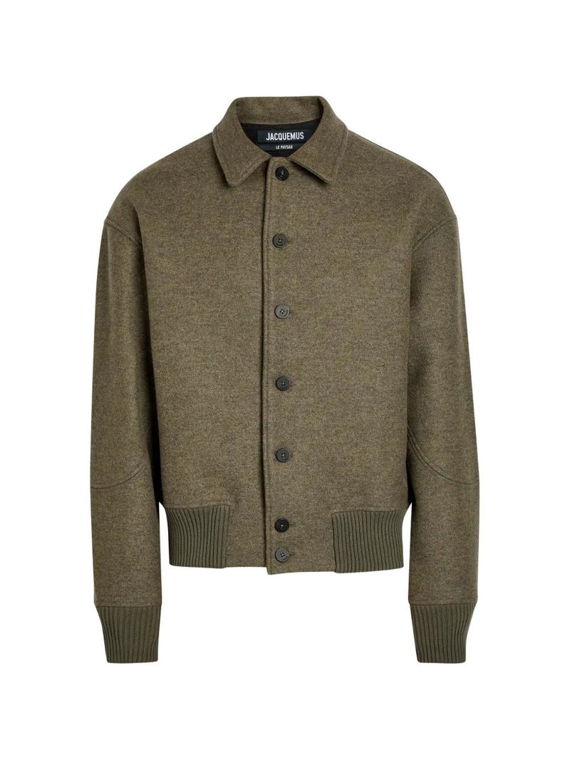 Dark green, ribbed hem, button fastening, turn-down collar, long sleeves, panelled sleeves.