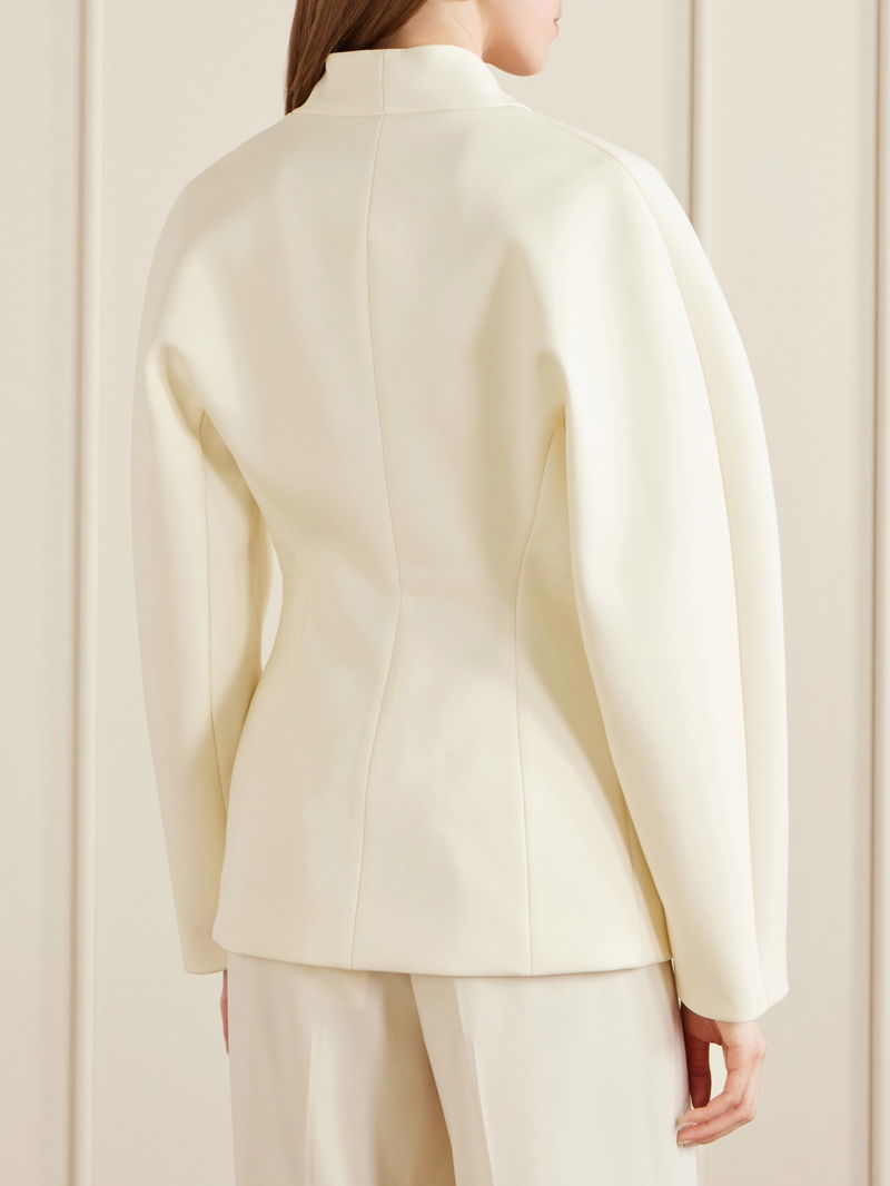 Jacquemus often reinterprets the classic blazer silhouette through a sculptural lens, as seen with 'The Châle'. Made from virgin wool-blend with a hint of stretch, it has a cinched waist that emphasizes the puff sleeves and a collarless design. Complement the deep V-neckline with a pendant necklace.
