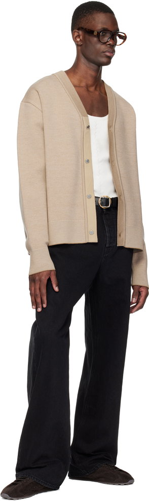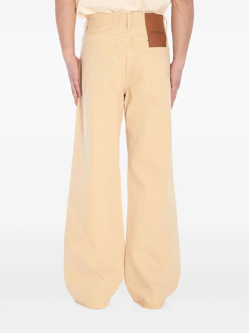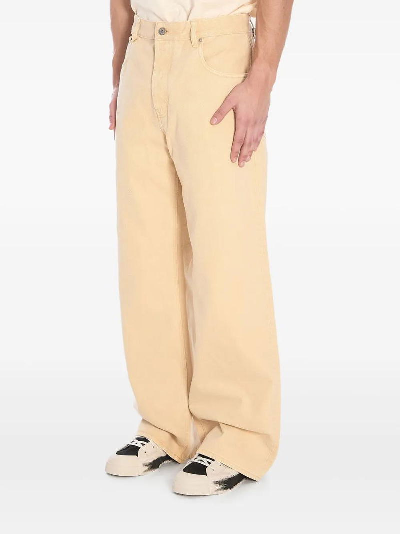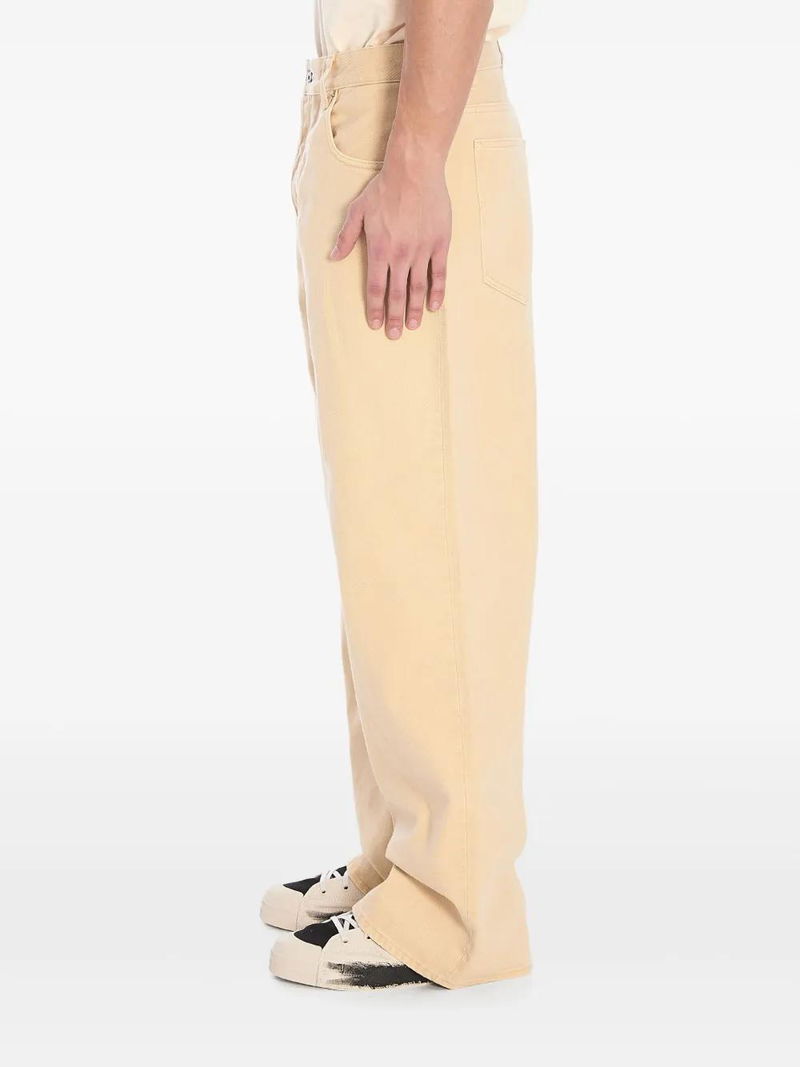 Beige concealed fly and button fastening belt loops classic five pockets logo patch to the rear.