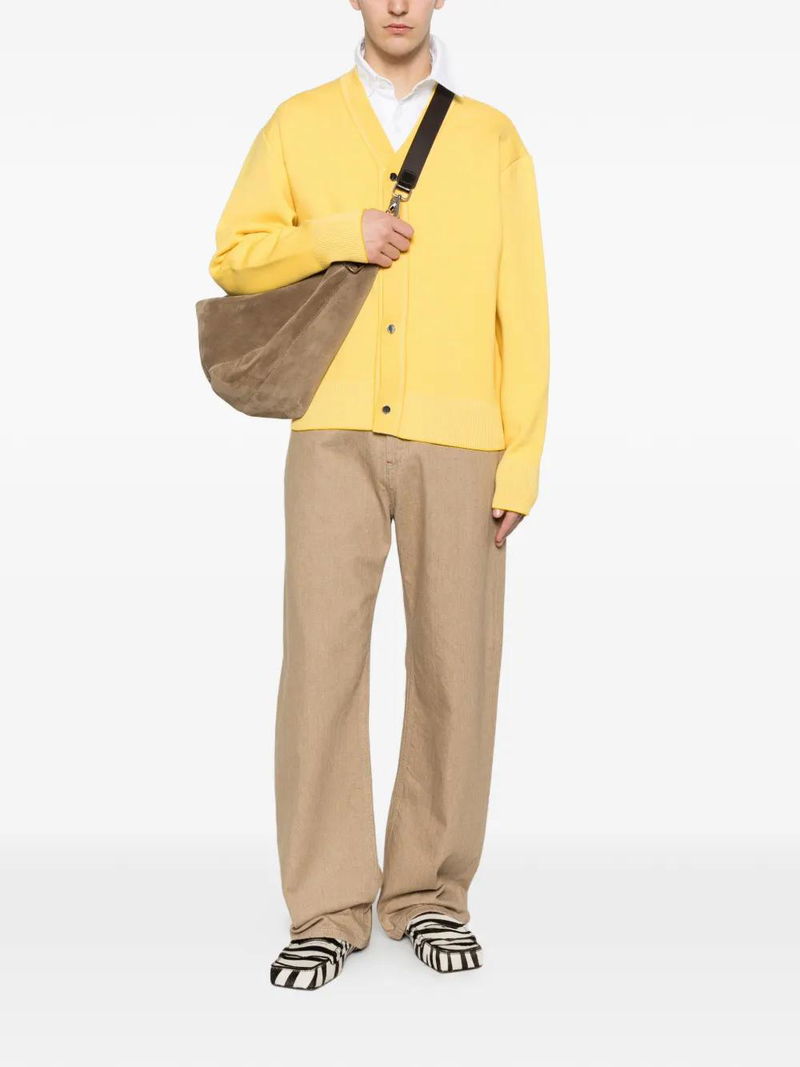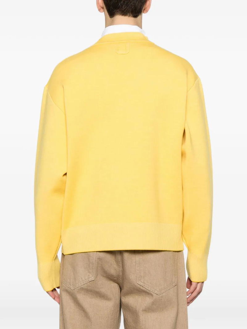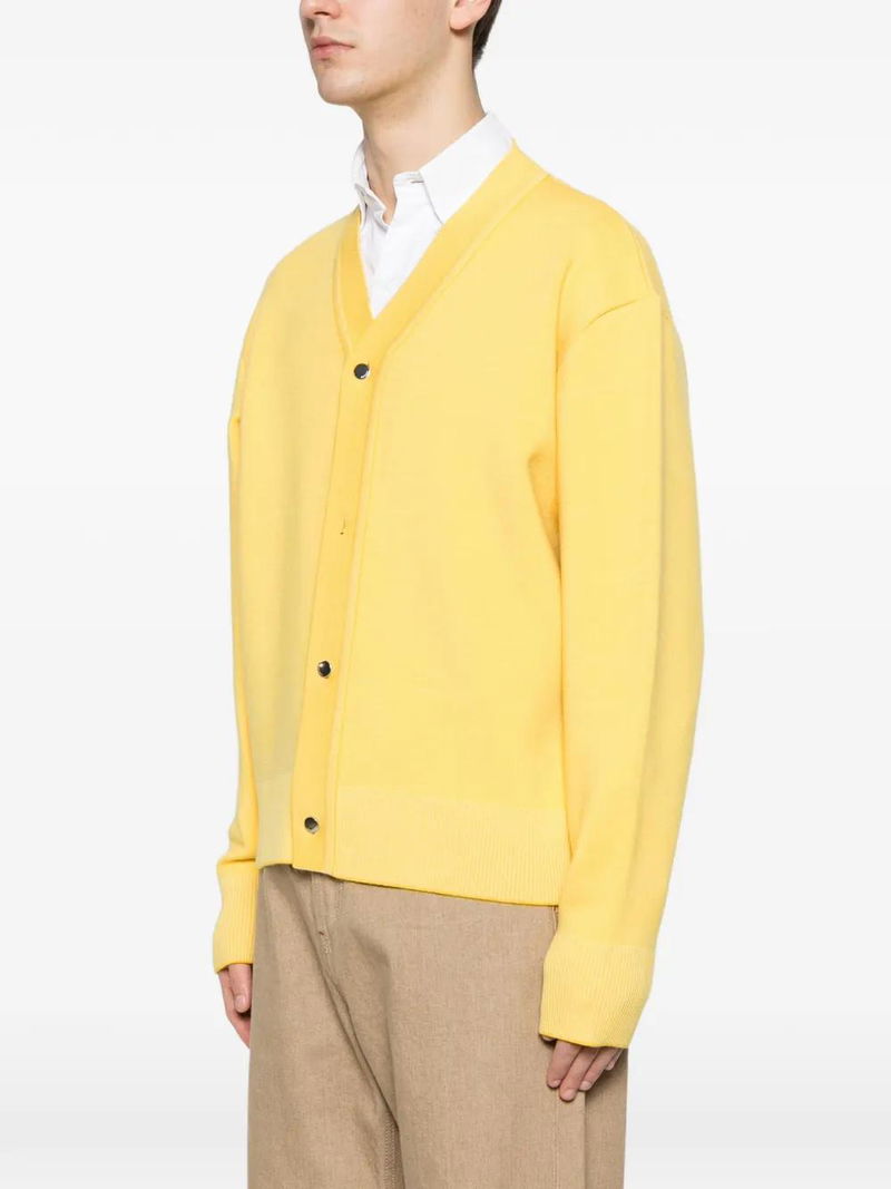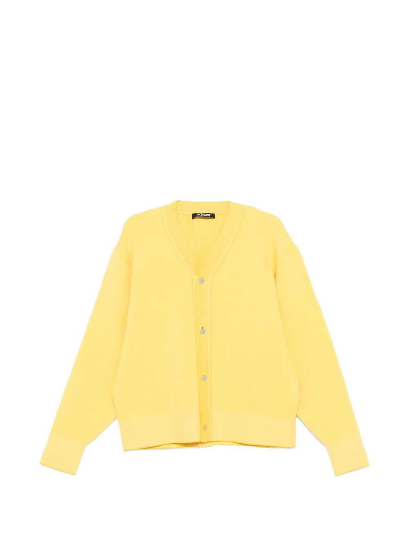 Yellow, V-neck, button fastening, long sleeves, ribbed trims.