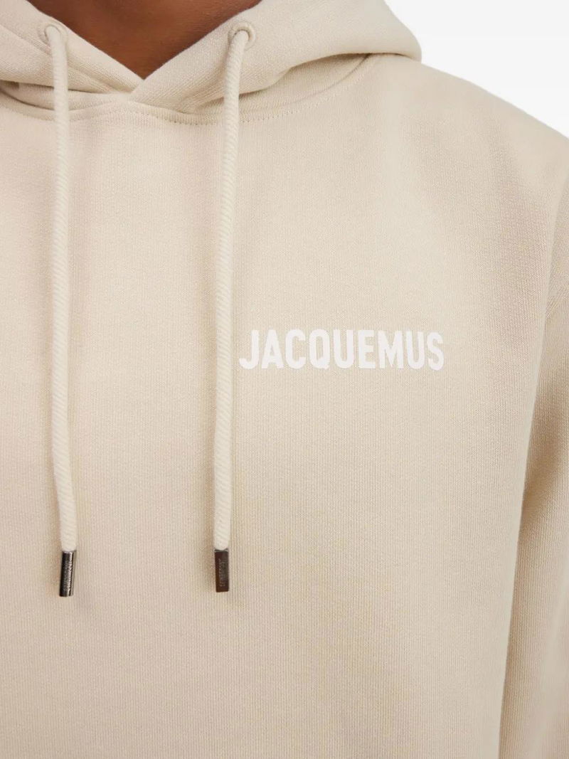 Light beige, cotton, pouch pocket, logo detail, drawstring hood, long sleeves.
