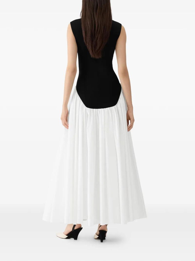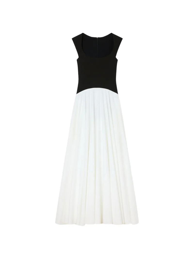 White and black, scoop neck, sleeveless.