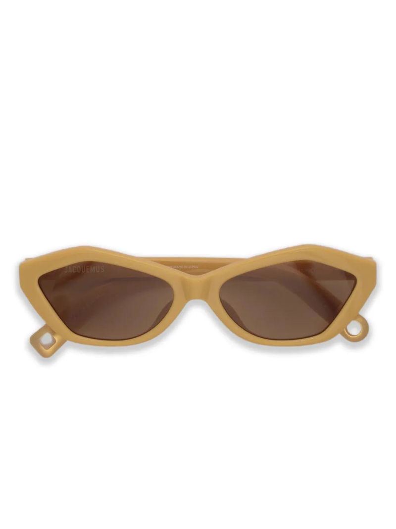 beige geometric frame brown lenses logo detail These glasses come with a protective case.