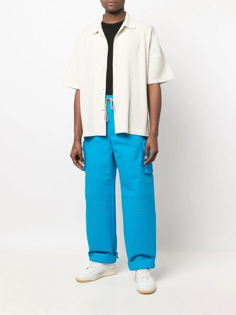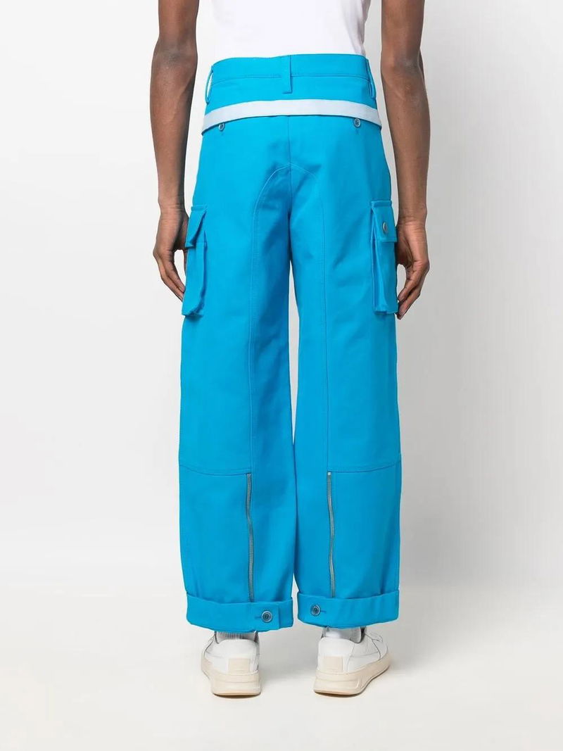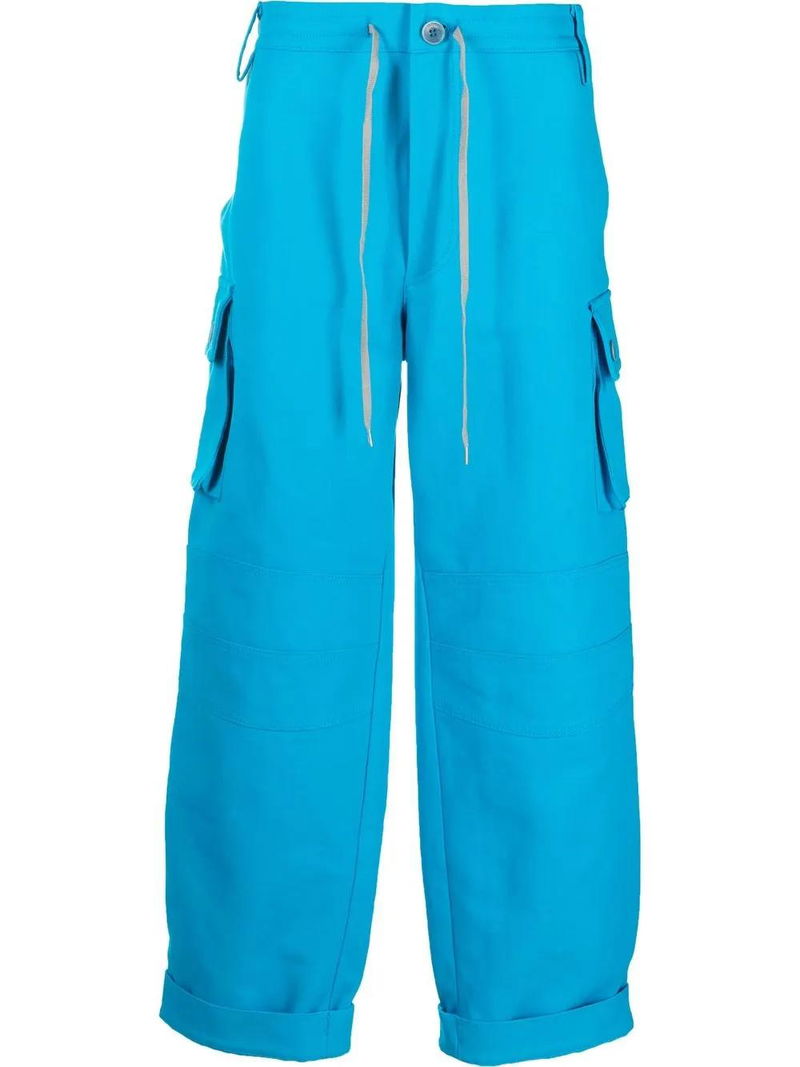 Blue cotton two side cargo pockets drawstring fastening waist belt loops straight leg