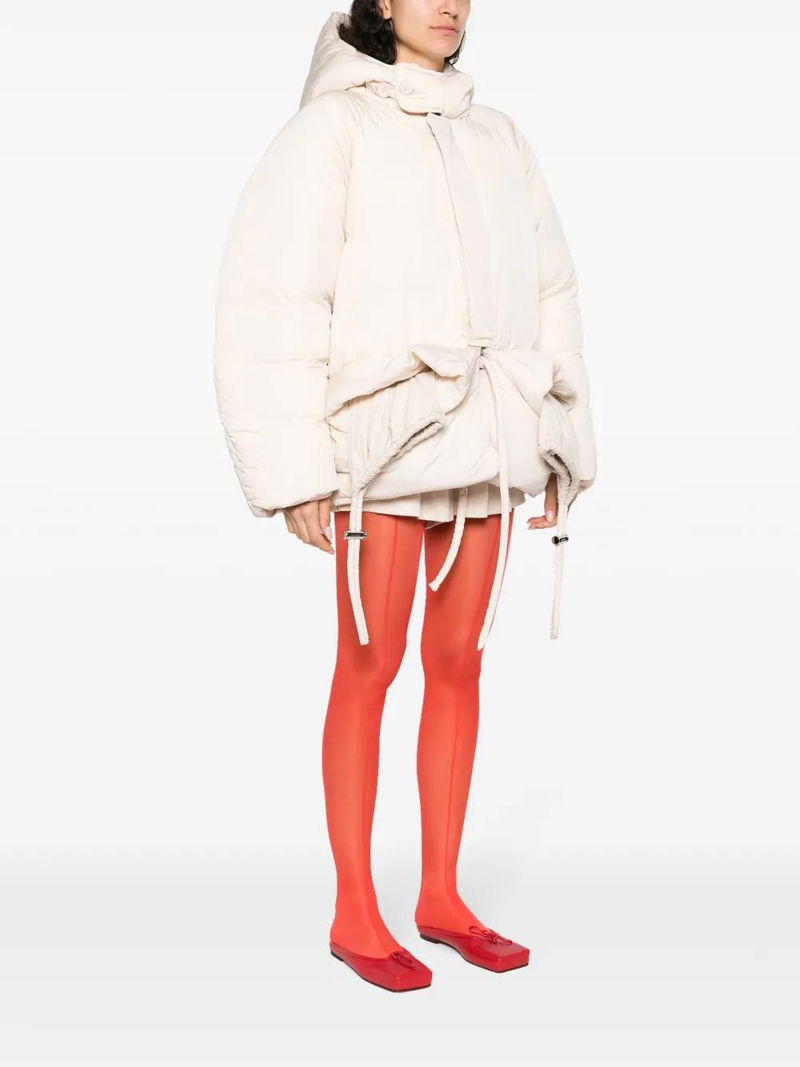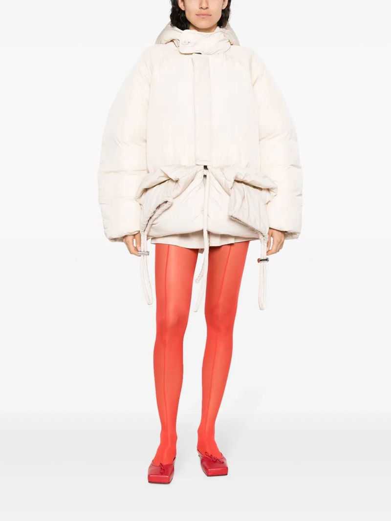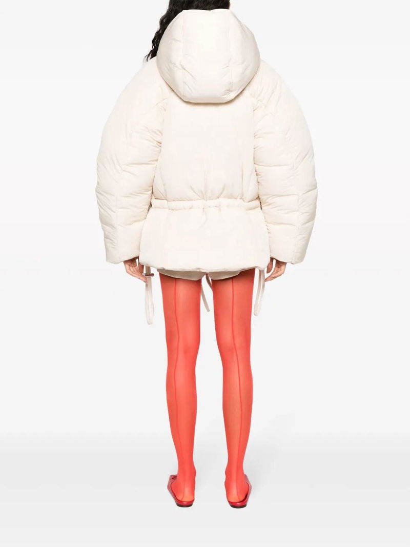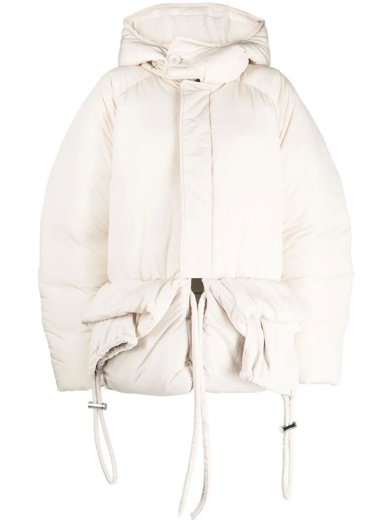 Off-white padded design slouchy hood high neck concealed front button fastening internal drawstring fastening waist long raglan sleeves two front flap pockets water-repellent.