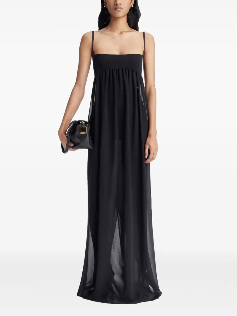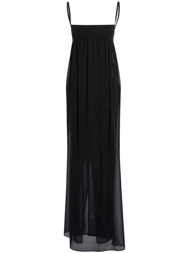 black jersey/muslin rear buckle fastening square neck spaghetti straps open back empire line layered skirt floor-length