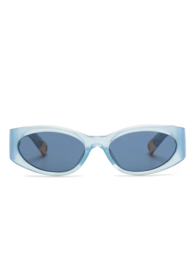 light blue acetate transparent design oval frame tinted lenses logo-engraved arm straight arms curved tips These glasses come with a protective case.