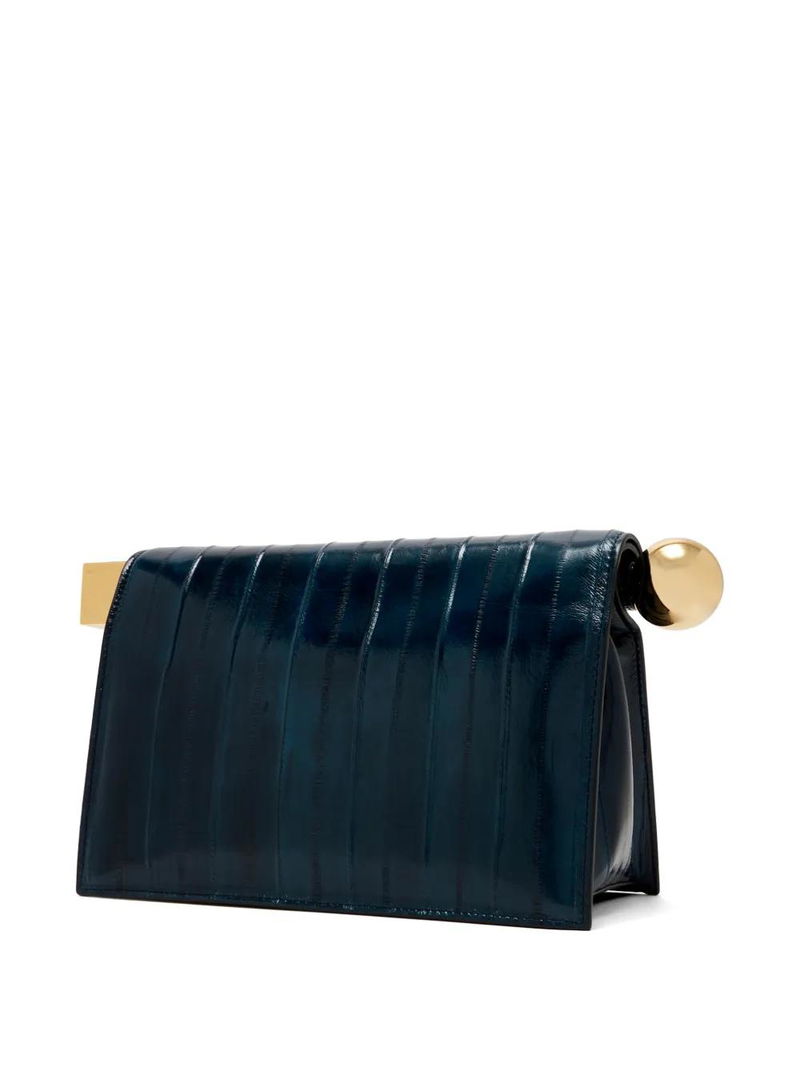 Dark navy metallic hardware top handle vertical stripe design shoulder strap internal slip pocket.