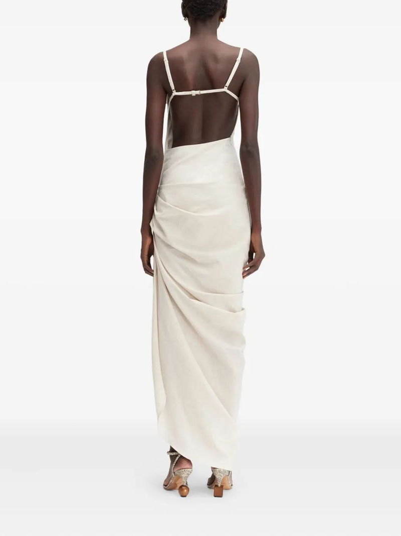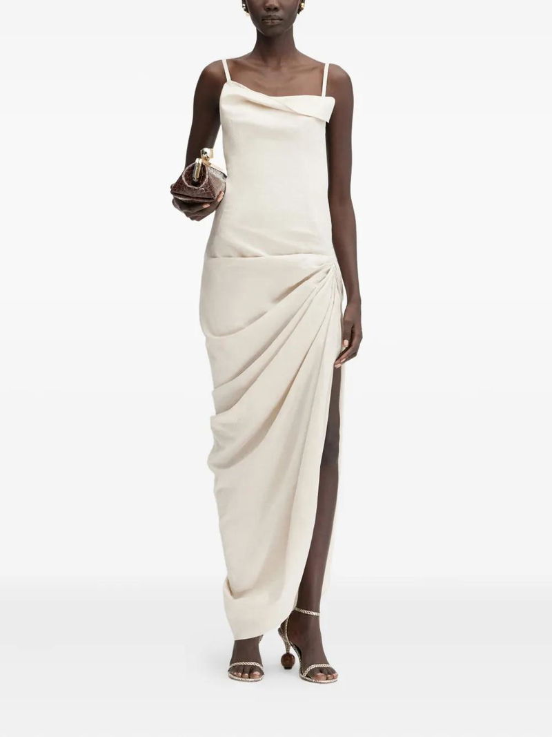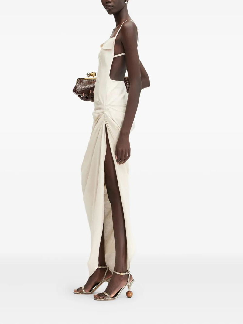 beige draped detailing open back spaghetti straps asymmetrical hem side slit
