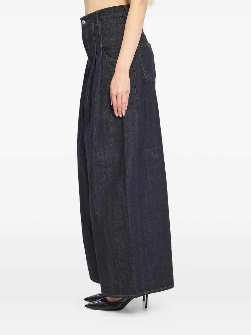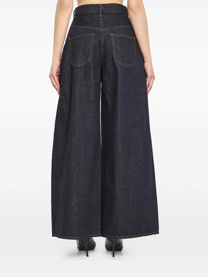 Dark blue, cotton, five pockets, belt loops, contrast stitching, side embroidery.