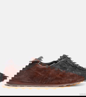 Dark beige suede almond toe lace-up closure debossed signature tongue orange interior This piece comes complete with a protective dust bag.