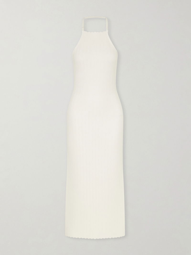 Jacquemus’ "Tablier" dress suits warm summer days and nights alike. Crafted from compacted knit, it features a chevron pattern from neckline to hem and a halter neckline. Style it with stacked bangles.