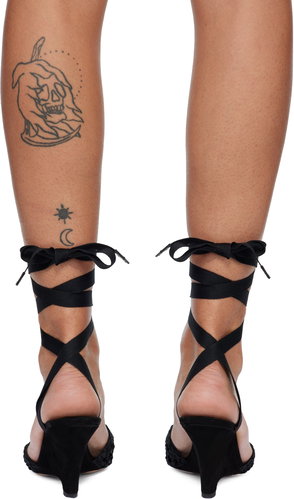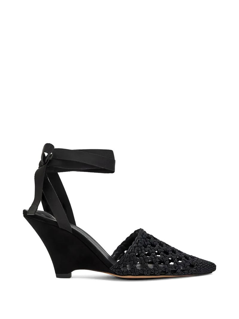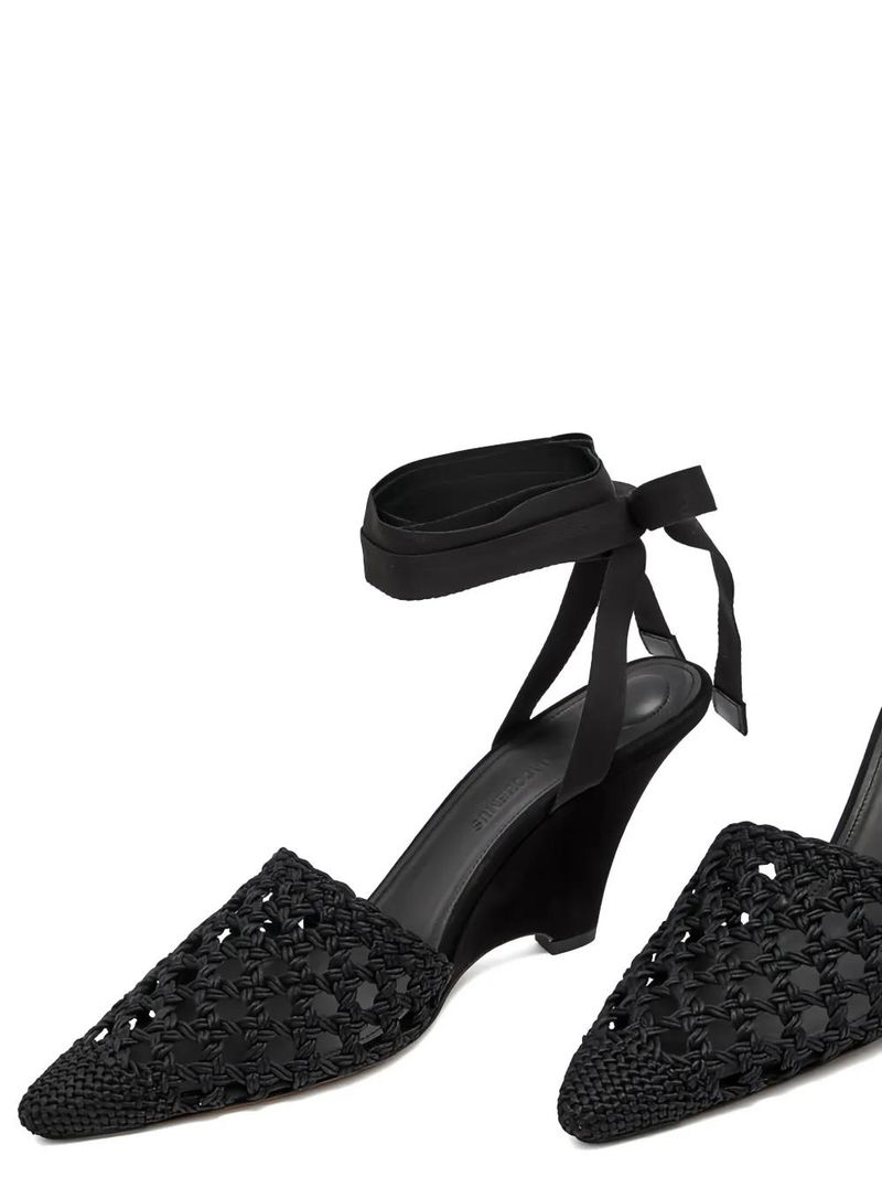 Black, woven detailing, tie fastening, pointed toe, wedge heel.
