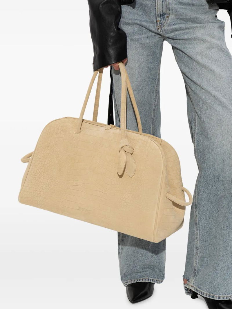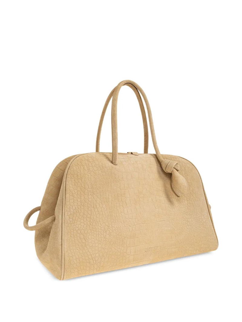 Beige crocodile-effect leather double top-handle knotted detail top zip fastening.