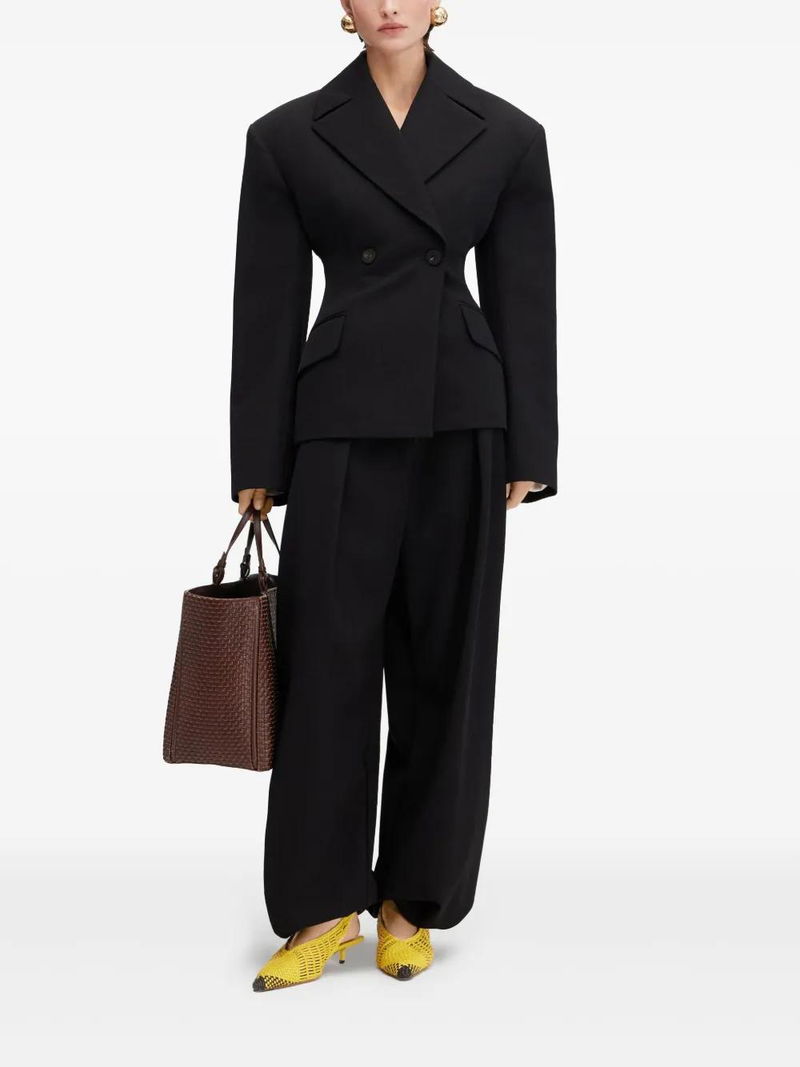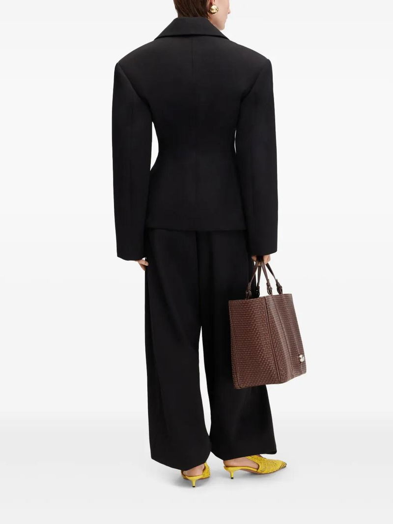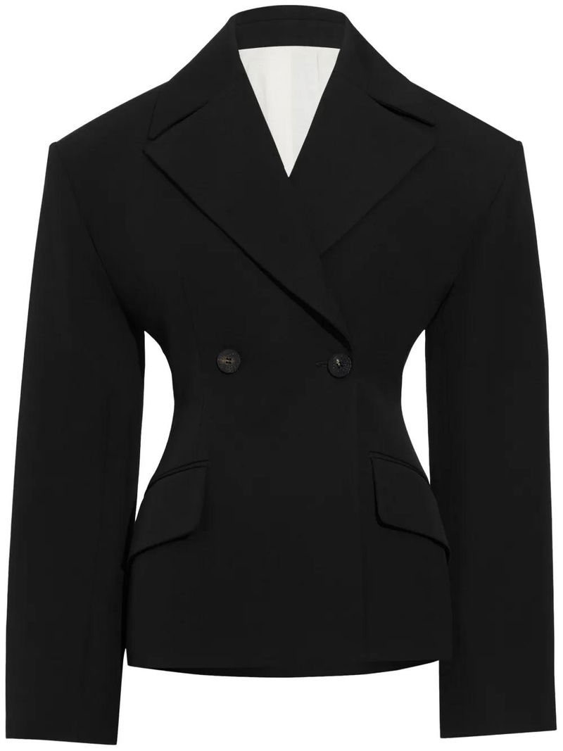 black double-breasted button fastening shoulder pads two side flap pockets American rear vent