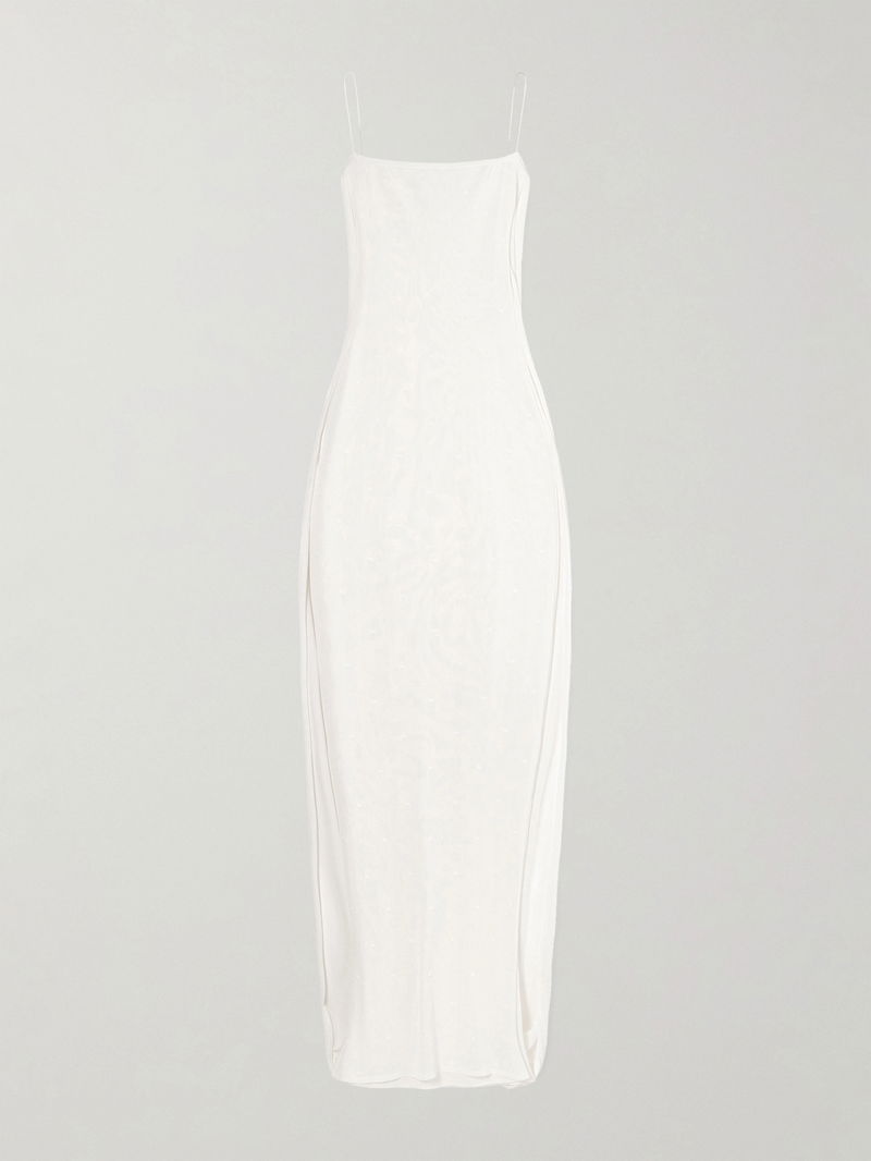Jacquemus' 'The Plumetis' dress is part of its 'Le Paysan' Spring '26 collection, referencing the southern French countryside. Made from finely knitted Swiss-dot jersey, it has spaghetti straps and a draped cowl back.