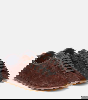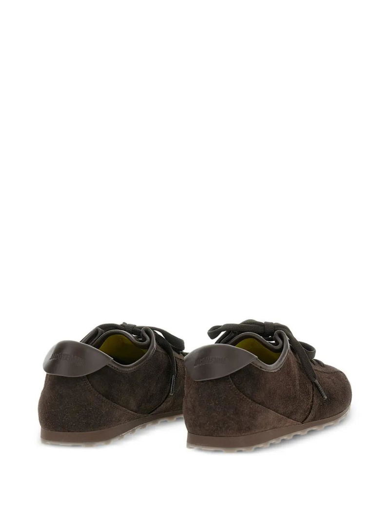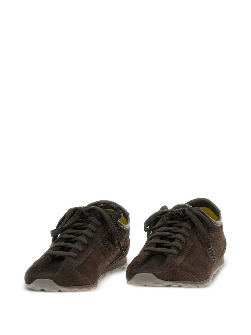 Brown suede almond toe flat laces rubber sole.
