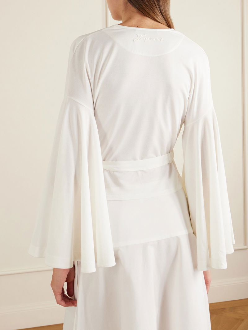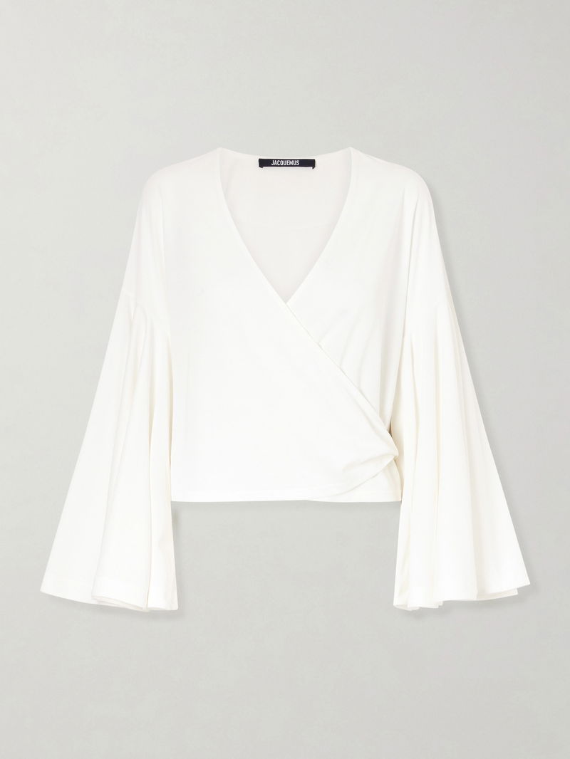Jacquemus’ ‘Ventadou’ top captures the house’s sun-drenched spirit. Effortlessly draped from an airy paper-blend, it wraps softly around the waist and is framed by flowy sleeves for a romantic finish.