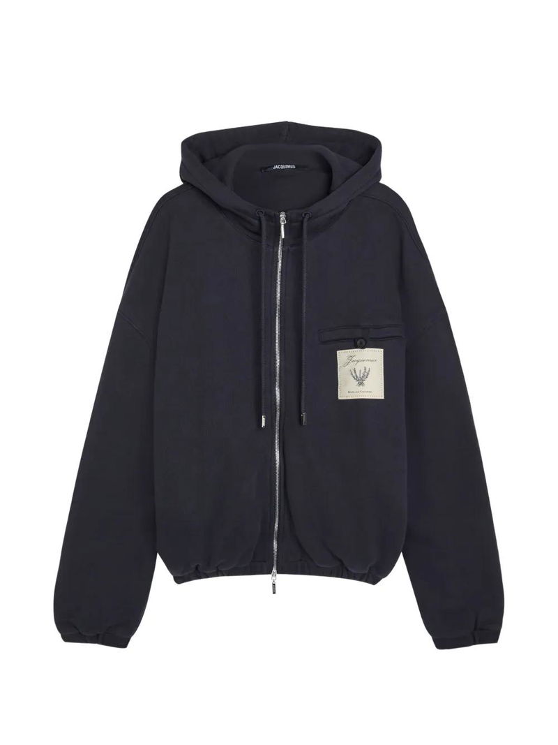 Dark navy, patch pocket, drawstring hood, zip fastening.