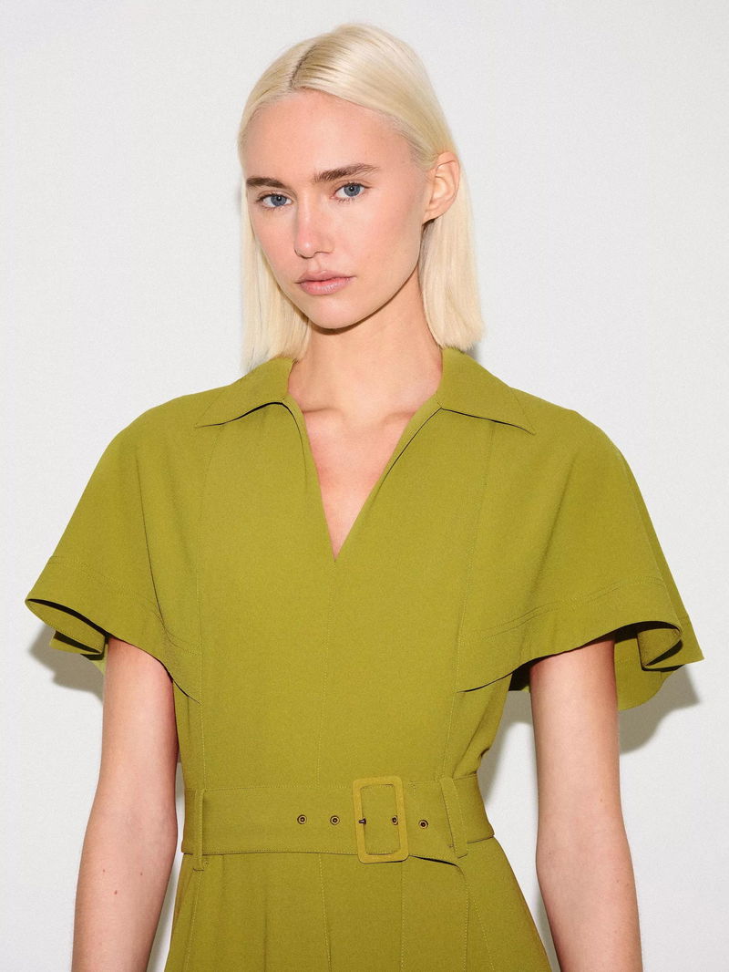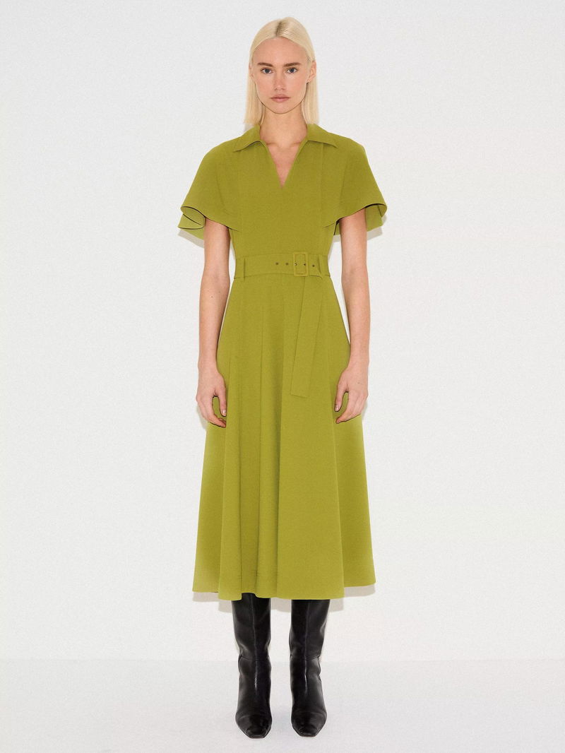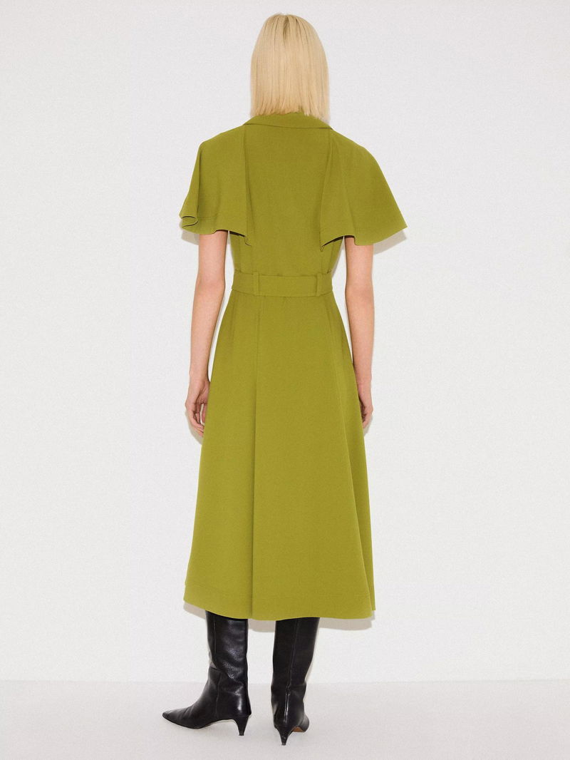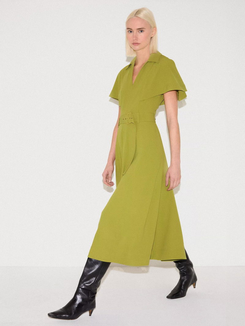 A contemporary update to the classic shirt dress, this piece features dramatic cape sleeves and a belted waist for a flattering silhouette.