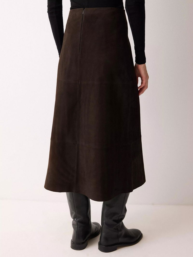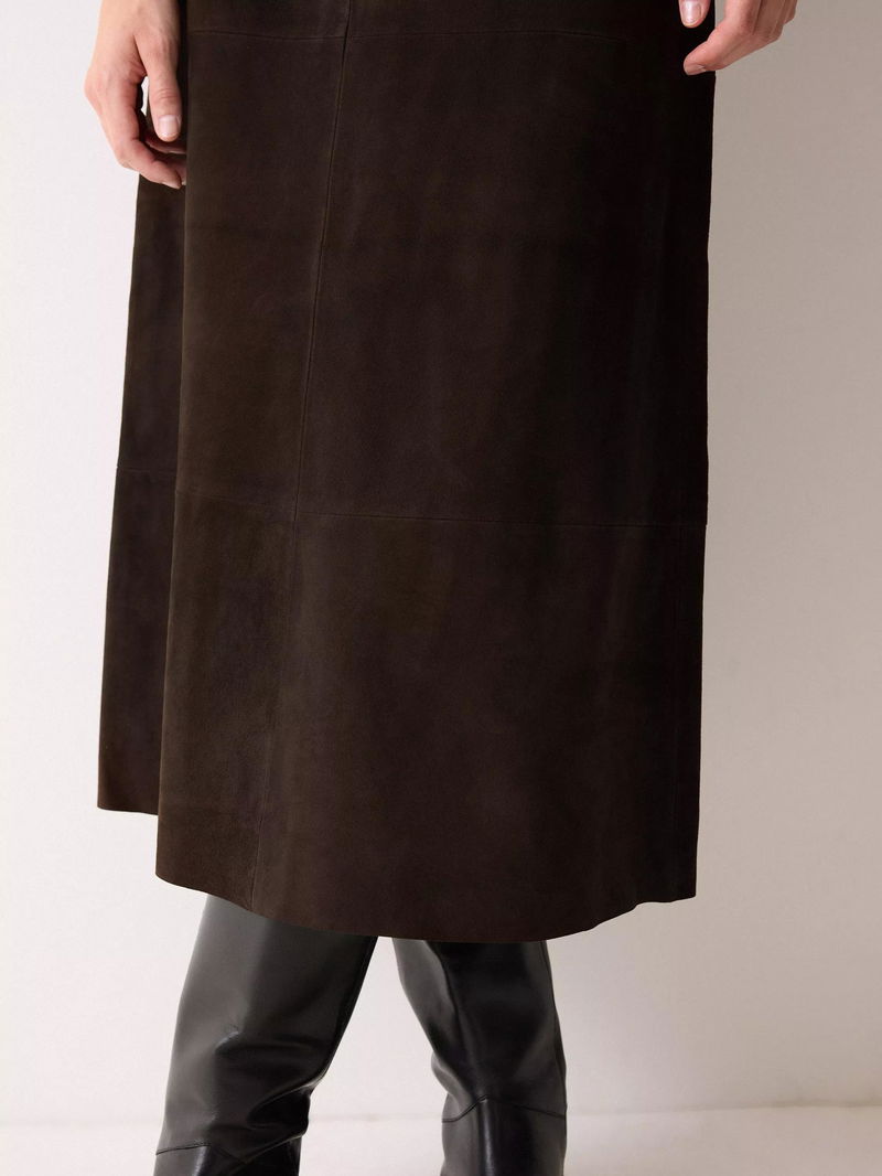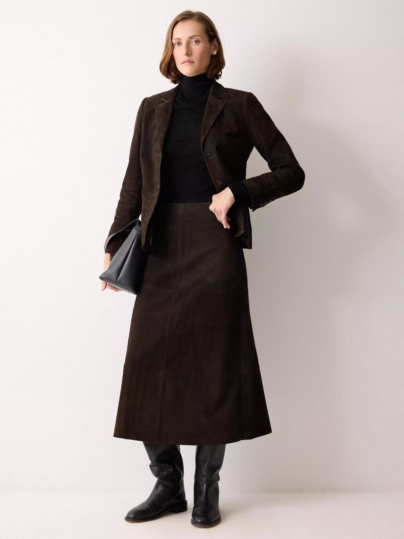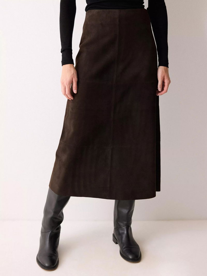 Suede shows its surprisingly fluid side with this 70s-inspired midi skirt. Super soft and supple in texture, this timeless and comfortable piece offers beautiful movement in a gentle A-line silhouette. The suede leather is designed to soften over time, developing a natural patina the more this skirt is worn and cherished. Smarten it up with a turtle neck jumper and the matching suede jacket.
