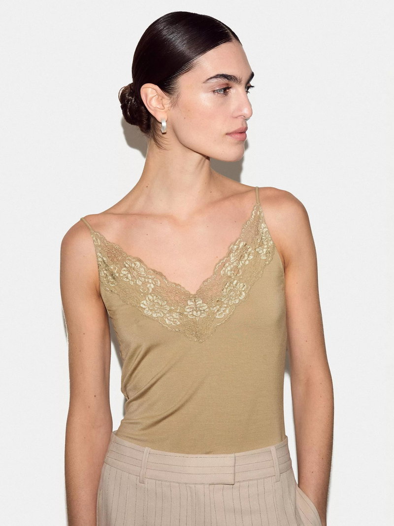 This modal lace vest is a bestselling underlayer. Cut from soft modal jersey with slim adjustable straps, the lace trim detail adds a subtle vintage-inspired twist.