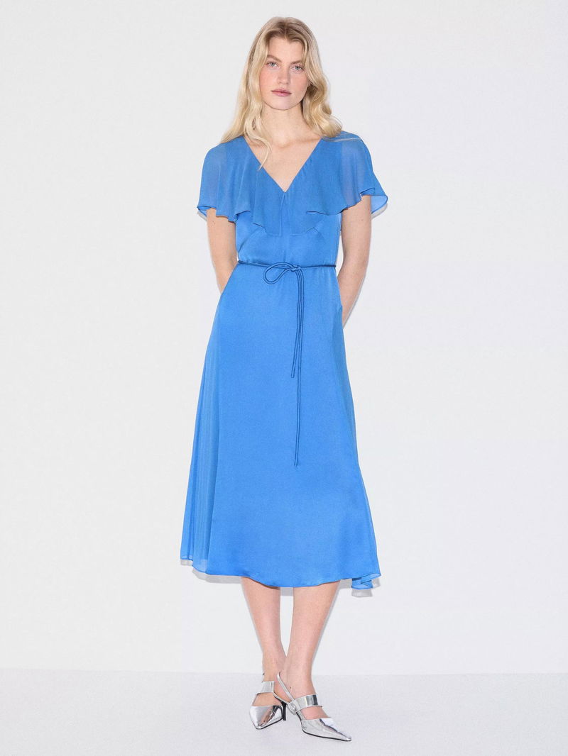 A show-stopping piece for special occasions, this sheer cape dress combines elegance with modernity. The flowing cape detail adds dramatic movement, while the fitted silhouette underneath ensures a flattering fit.