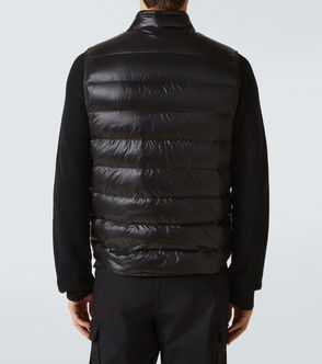 Down-filled quilted polyester taffeta vest.· Hood at stand collar· Two-way zip closure· Seam pockets· Bungee-style drawstring at hem· Full quilted taffeta lining.