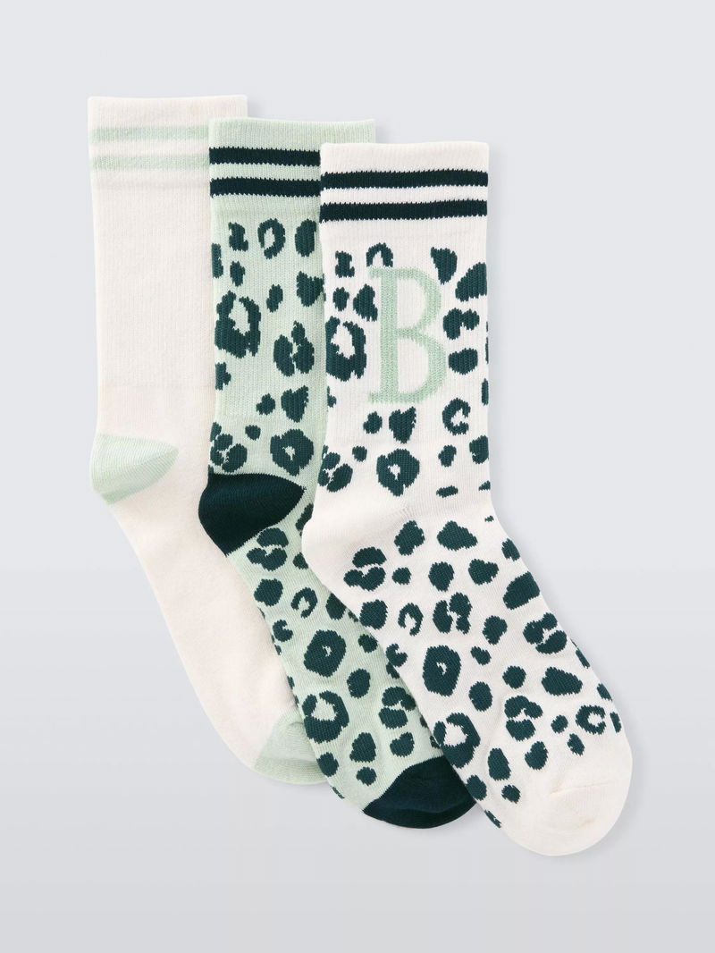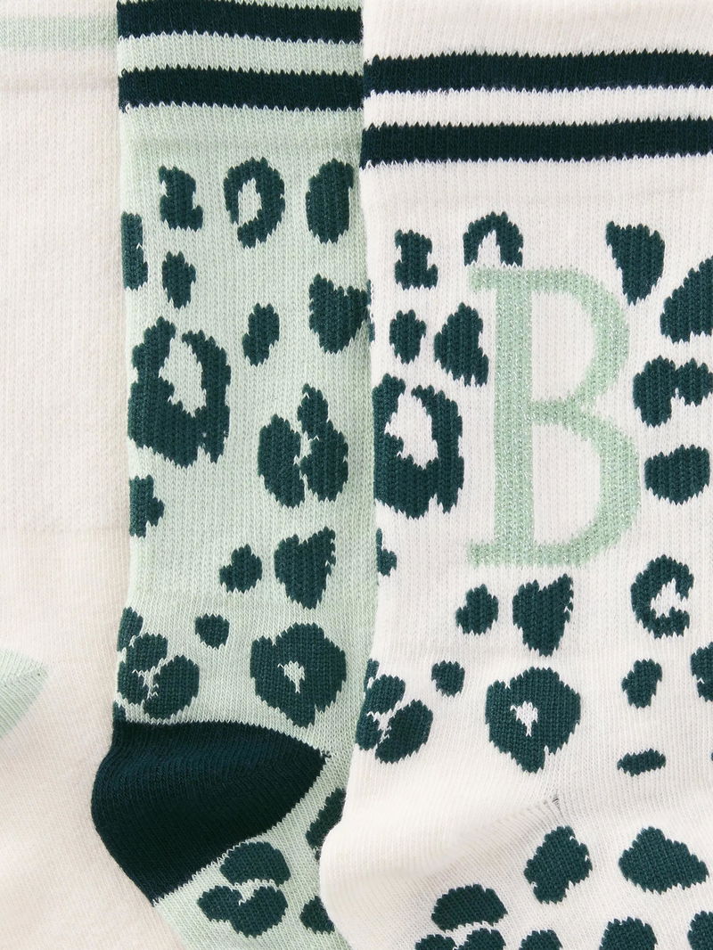 Animal Print Alphabet Ankle Socks, B, Pack Of 3, Green