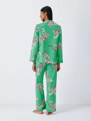 Floral Stripe Pure Cotton Button Through Long Pyjama Set, Green/Pink