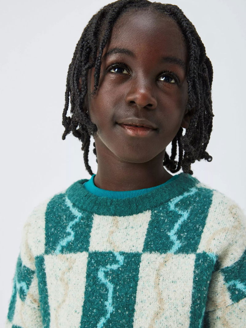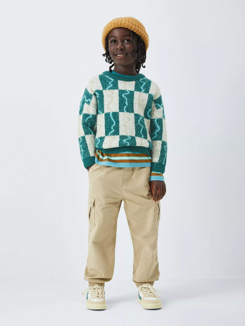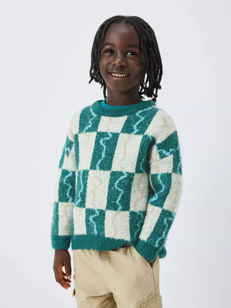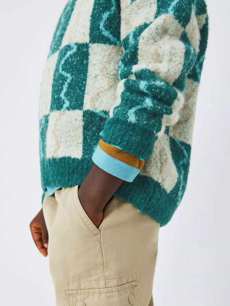 Kids' Checkerboard Knit Jumper, Teal/Cream