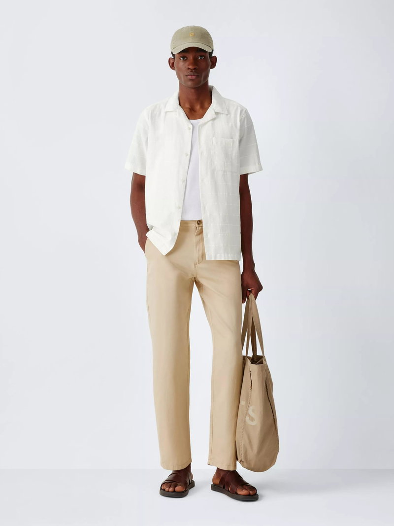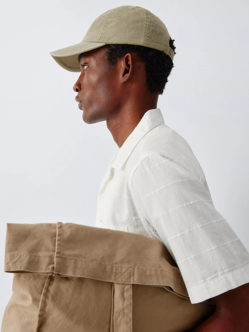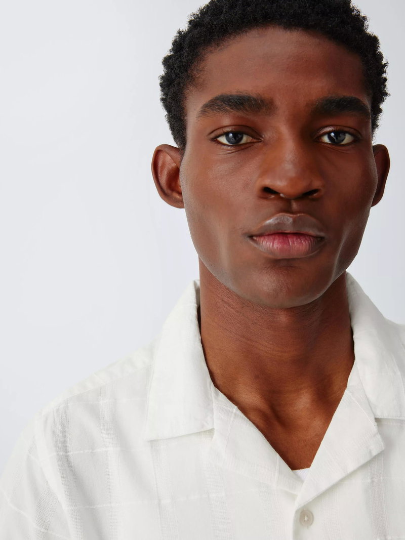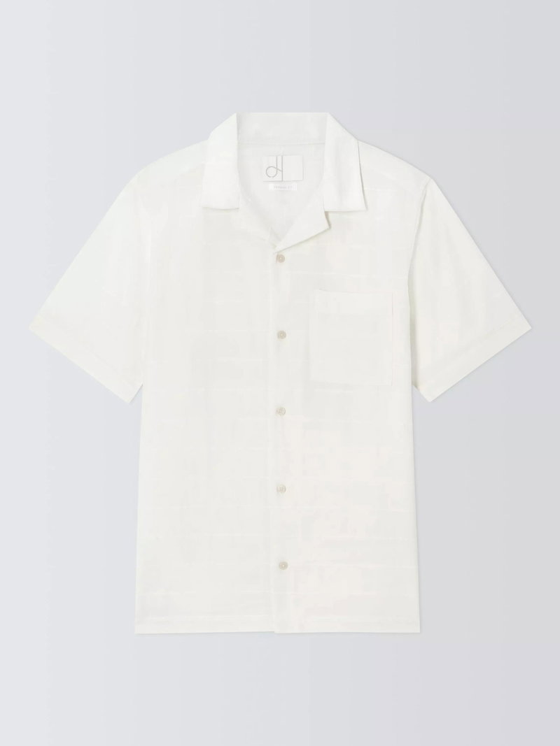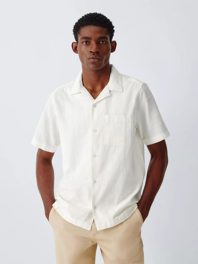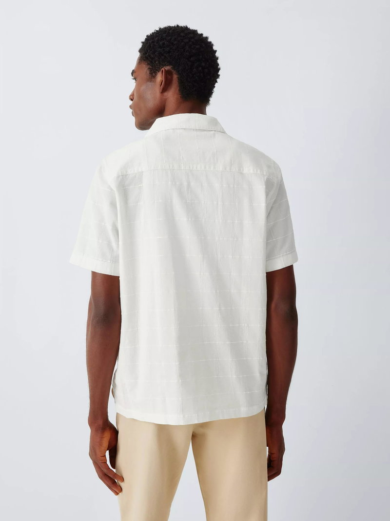 Defined by its intricate self-check weave, this short-sleeve shirt offers a sophisticated take on tactile summer dressing. The subtle geometric pattern is woven directly into the cotton, providing a refined depth and a structured yet breathable feel that elevates it beyond standard plains. The texture ensures the garment remains hardwearing while maintaining a soft, lived-in handle against the skin. The relaxed Cuban collar and straight-cut hem lend a contemporary edge.
