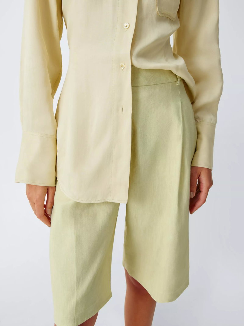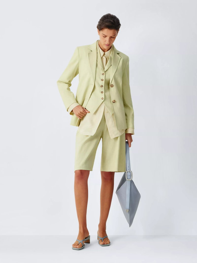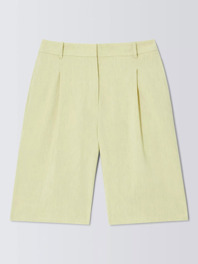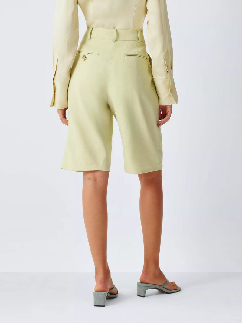 Tailored Bermuda shorts with a sharp front pleat and knee-length cut for a polished aesthetic. The linen-rich fabric blend with cotton ensures breathability and a lightweight feel that's ideal for warmer months. Finished with belt loops, a smooth lining, side pockets and back welt pockets.