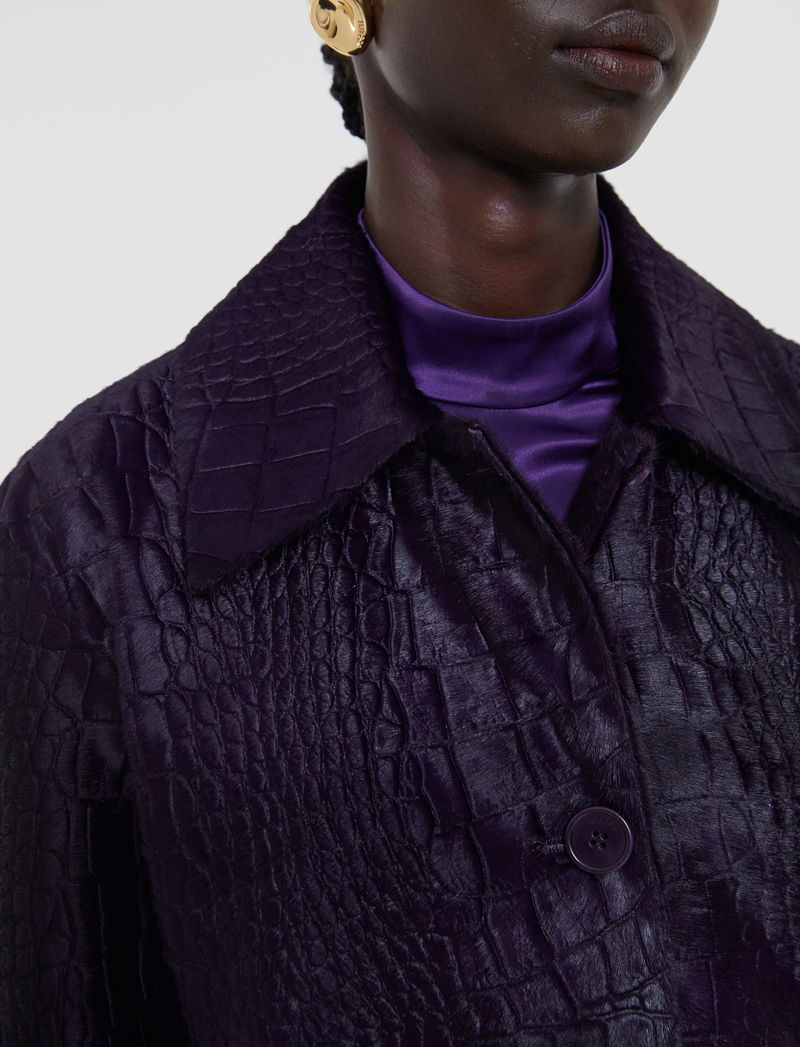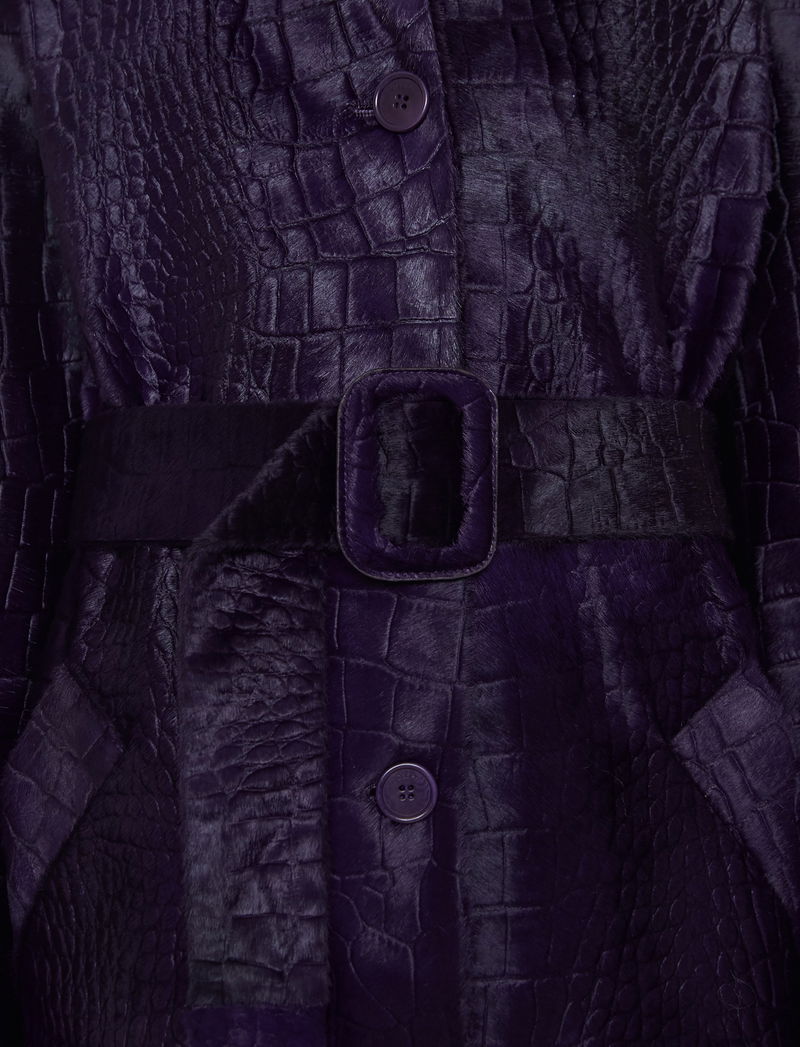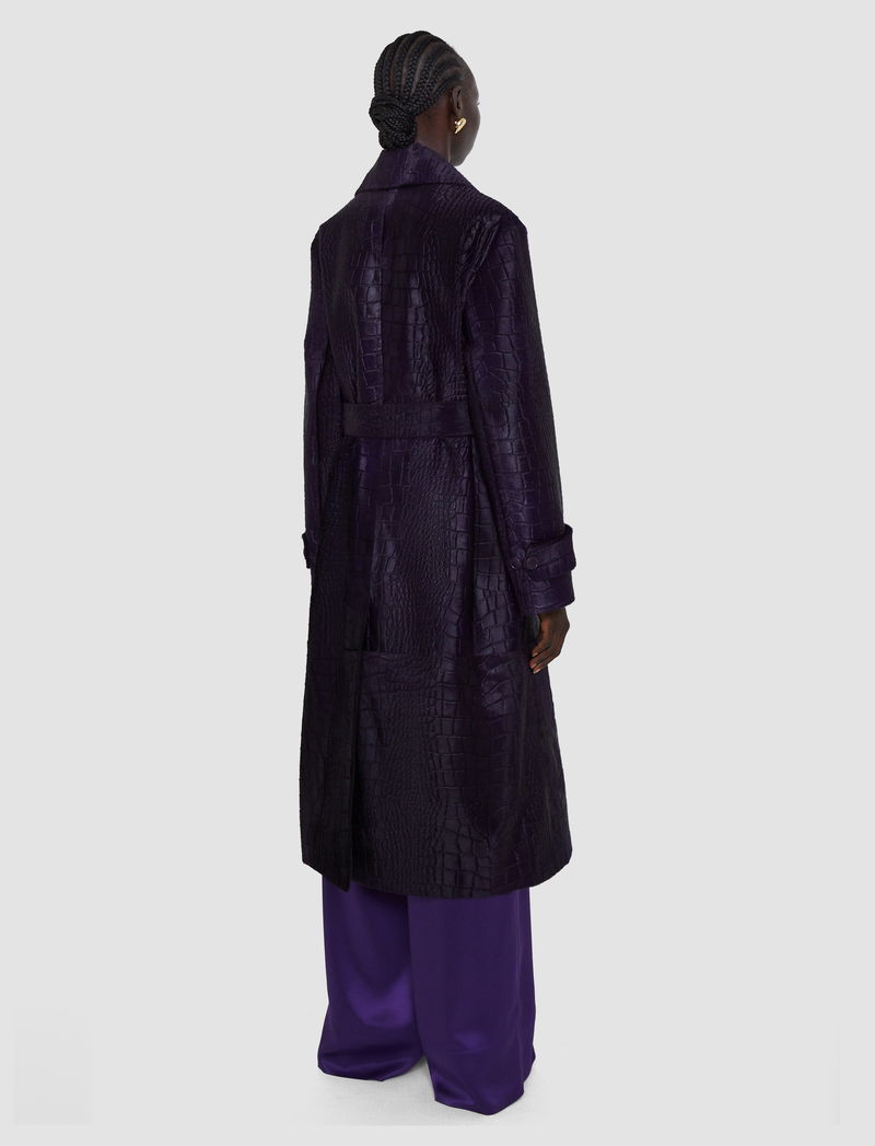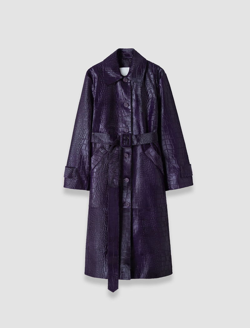 The Auger Embossed Croc Leather Coat is a regular fit trench coat, crafted from 100% leather. This statement coat exudes luxury with its embossed crocodile pattern and smooth, pony-haired texture. It's finished with a classic collar, slanted welt pockets and cuff tabs for a sharp, elegant look.