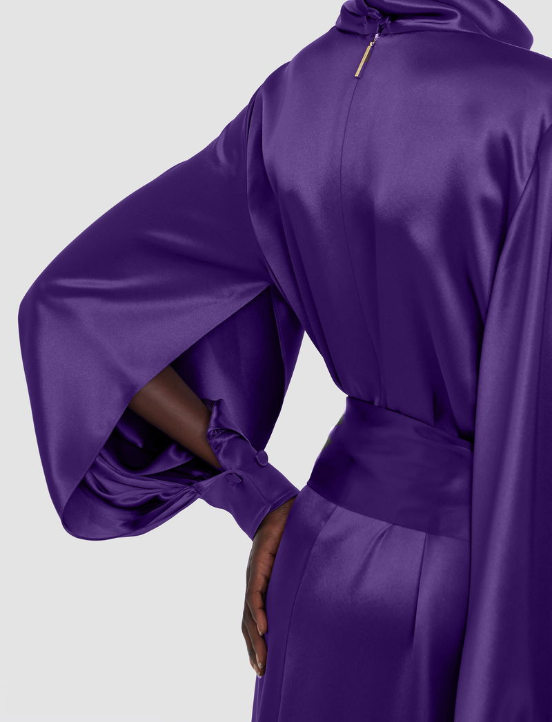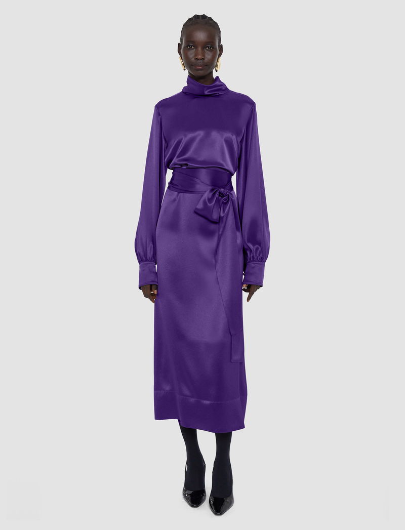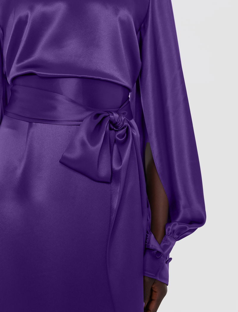 The Cels Double Satin Dress is a long, relaxed fit dress, crafted from a responsibly sourced acetate blend known for silky-soft hand feel and fluid drape. Its high neckline and blouson sleeves lend a romantic, sculptural shape. The design is finished with a removable belt to cinch the waist or style freely.