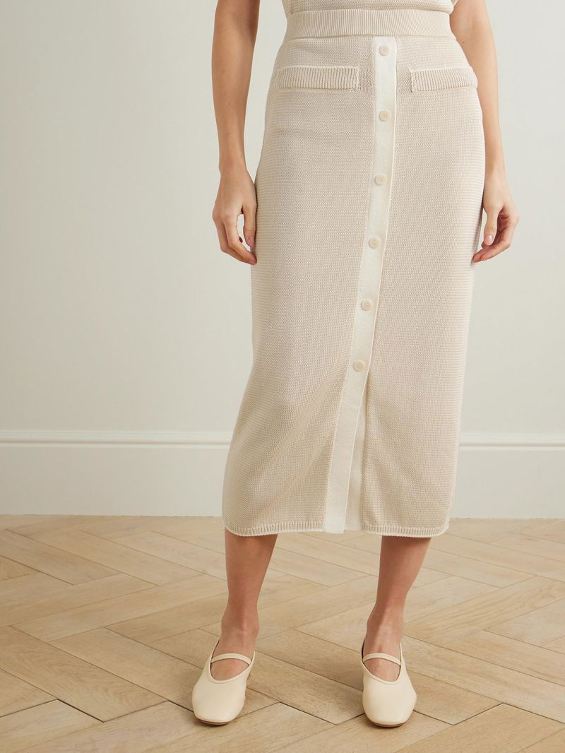 If you like to stick to neutrals, a great way to elevate your look is through texture, with items like Joseph's skirt. It's knitted from two-tone cotton for a tactile finish and has faux welt pockets and buttons along the front. Wear yours with a light cardigan or blouse.